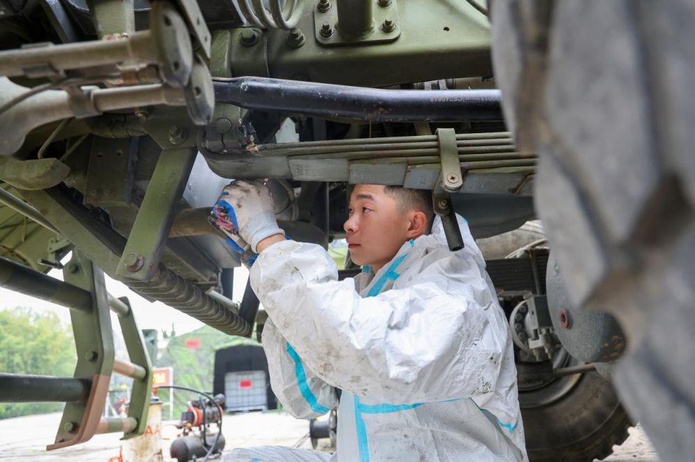 装备保养现场,官兵们爬车顶排故障、钻车底换机油,人员分工明确、忙而不乱,同时详细记录保养情况,确保全程可追溯。