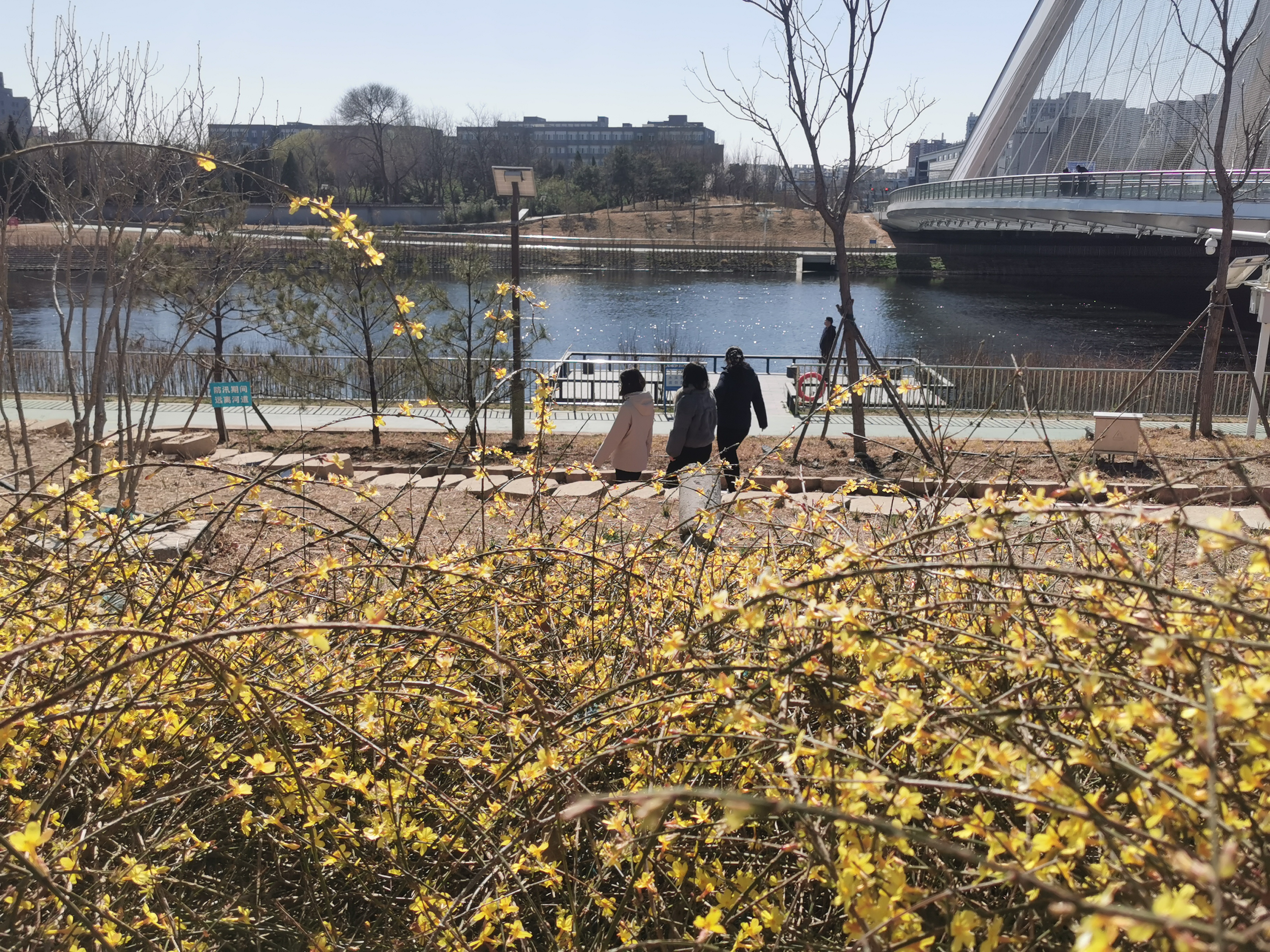 三月风软,寒意渐消,凉水河褪去冬日沉寂,两岸繁花次第绽放,勾勒出京城最温柔的早春图景。河畔最先报春的,是簇簇迎春花。纤长枝条垂落堤岸,金黄小花密密缀满,如金色瀑布倾泻而下,在微风里轻摇,点亮了整条河岸。紧接着,山桃竞相盛放,粉白的花朵与河水相映灵动又温婉。