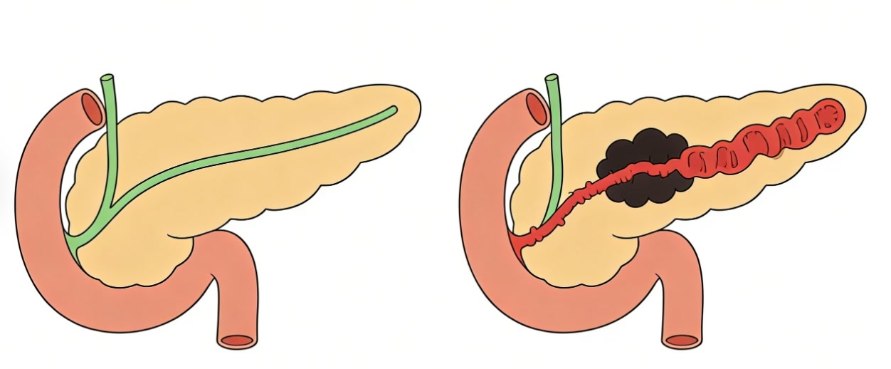 2.胰管扩张7mm+胰腺萎缩+远端增粗=典型的“梗阻表现”:胰体部肿块堵死胰管,胰液无法排出,导致上游胰管憋粗、胰腺组织长期梗阻萎缩,正常胰管直径<3mm,7mm属于明显扩张;