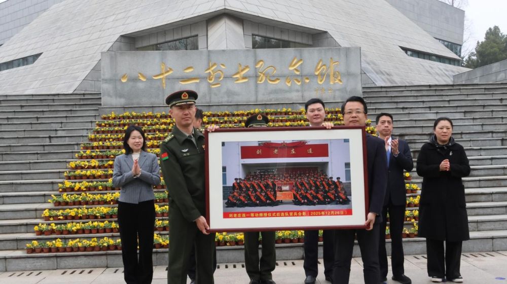 ↑官兵代表向新四军刘老庄连纪念园赠送全连官兵合影。崔帅宇 摄