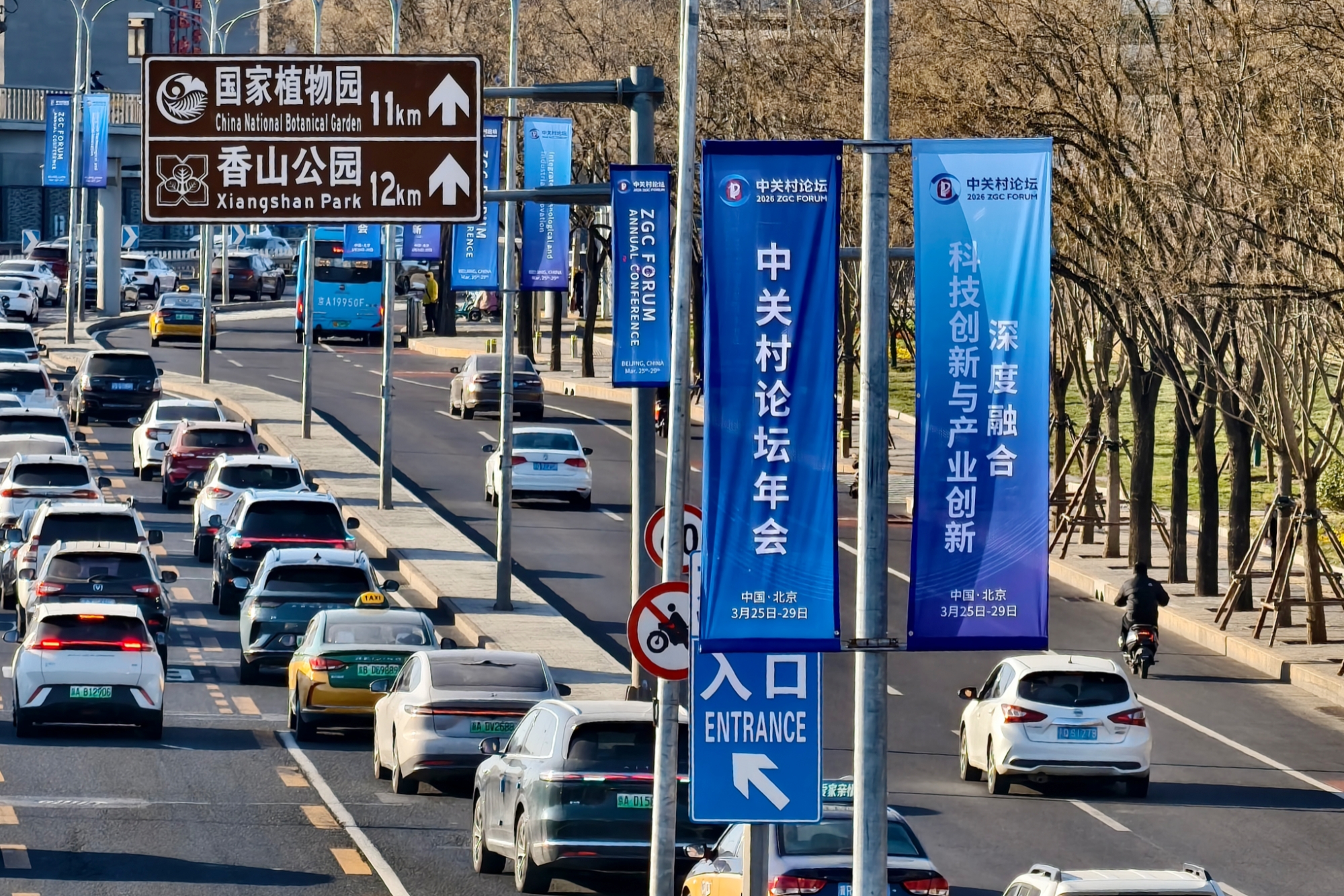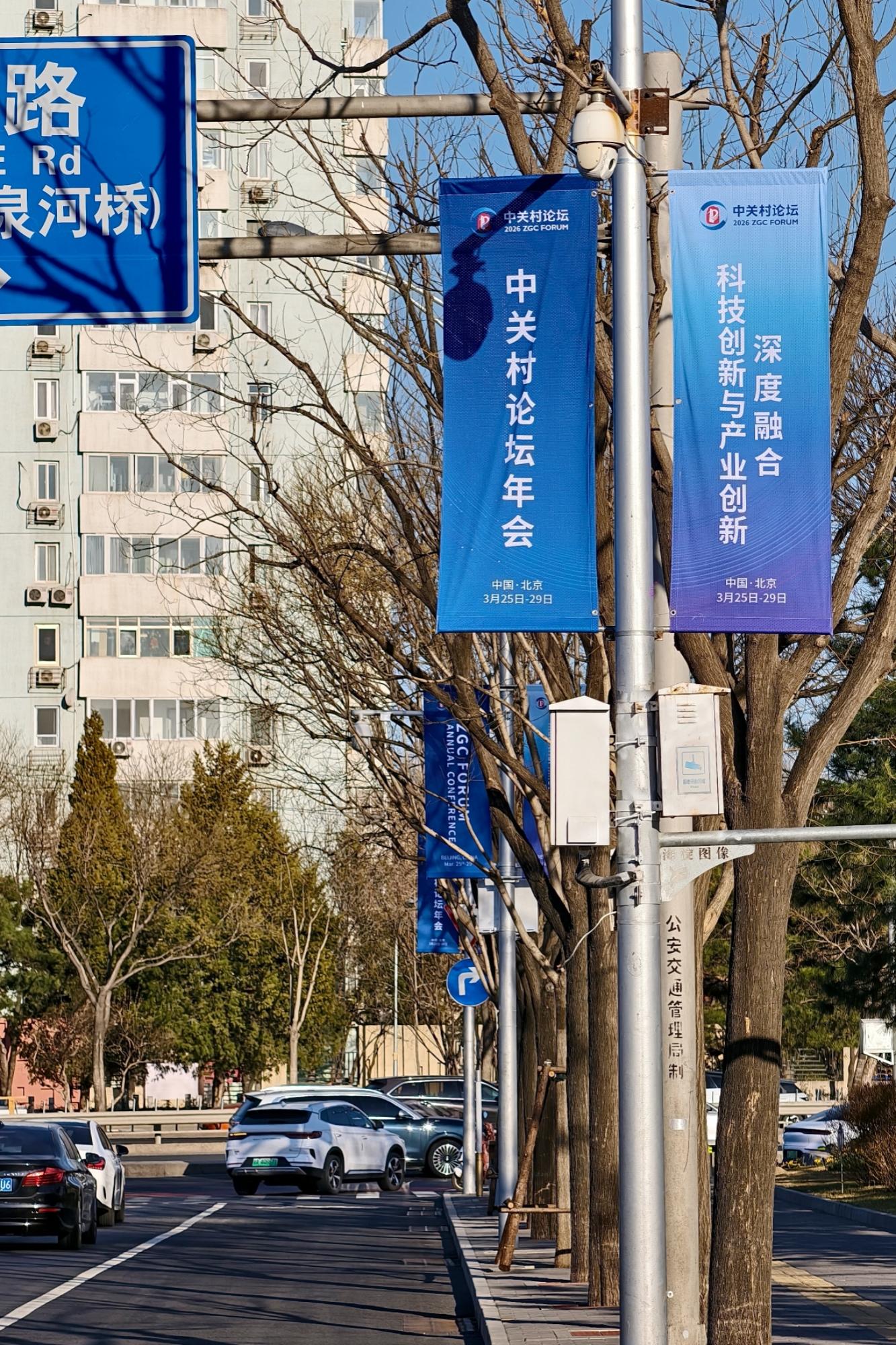 2026中关村论坛年会将于3月25日至29日在北京举办。3月18日,中关村国际创新中心周边,2026中关村论坛年会道旗飘扬,会场准备工作正在进行。