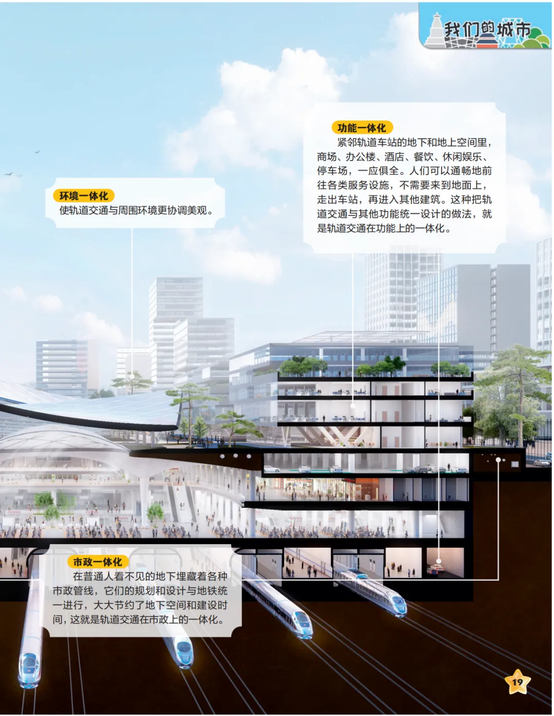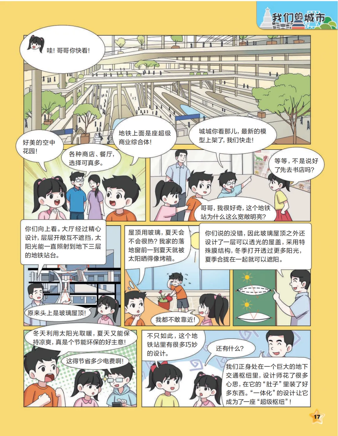 你有没有去过一种地铁站,大厅亮堂堂的,能沐浴阳光,还能逛、能吃、能休息,像把一座小城市装进了地底下。城城和小柿子跟着爸爸来到一座被叫作“轨道上的城市客厅”的地方。他们发现,这可不只是“坐车的站”,更像一台聪明的“城市机器”——它把换乘安排得更顺,把生活服务放得更近,让空间环境更舒服,还把地下那些“看不见但很重要”的东西也一起规划好。于是,大家到达、出发、相遇,都变得更方便、更安全、更高效。