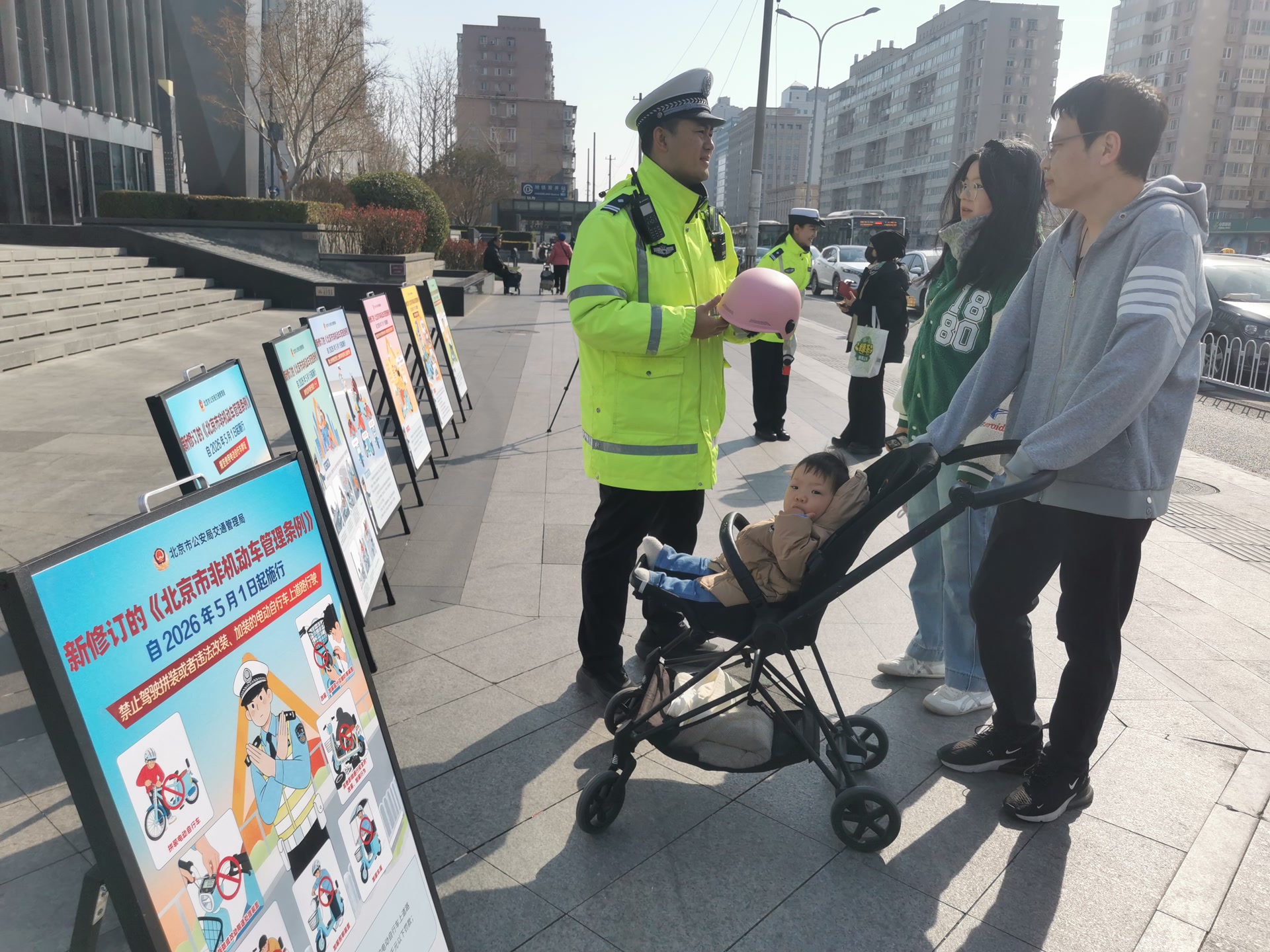 路口一侧,交管部门设立的新规宣传展板前,不少过路市民驻足观看。有人掏出手机对着宣传海报拍照,一位刚拍完照的中年男性驾驶员告诉记者:“我得拍下来回家让家人都看看,提醒他们以后骑车一定得戴。”