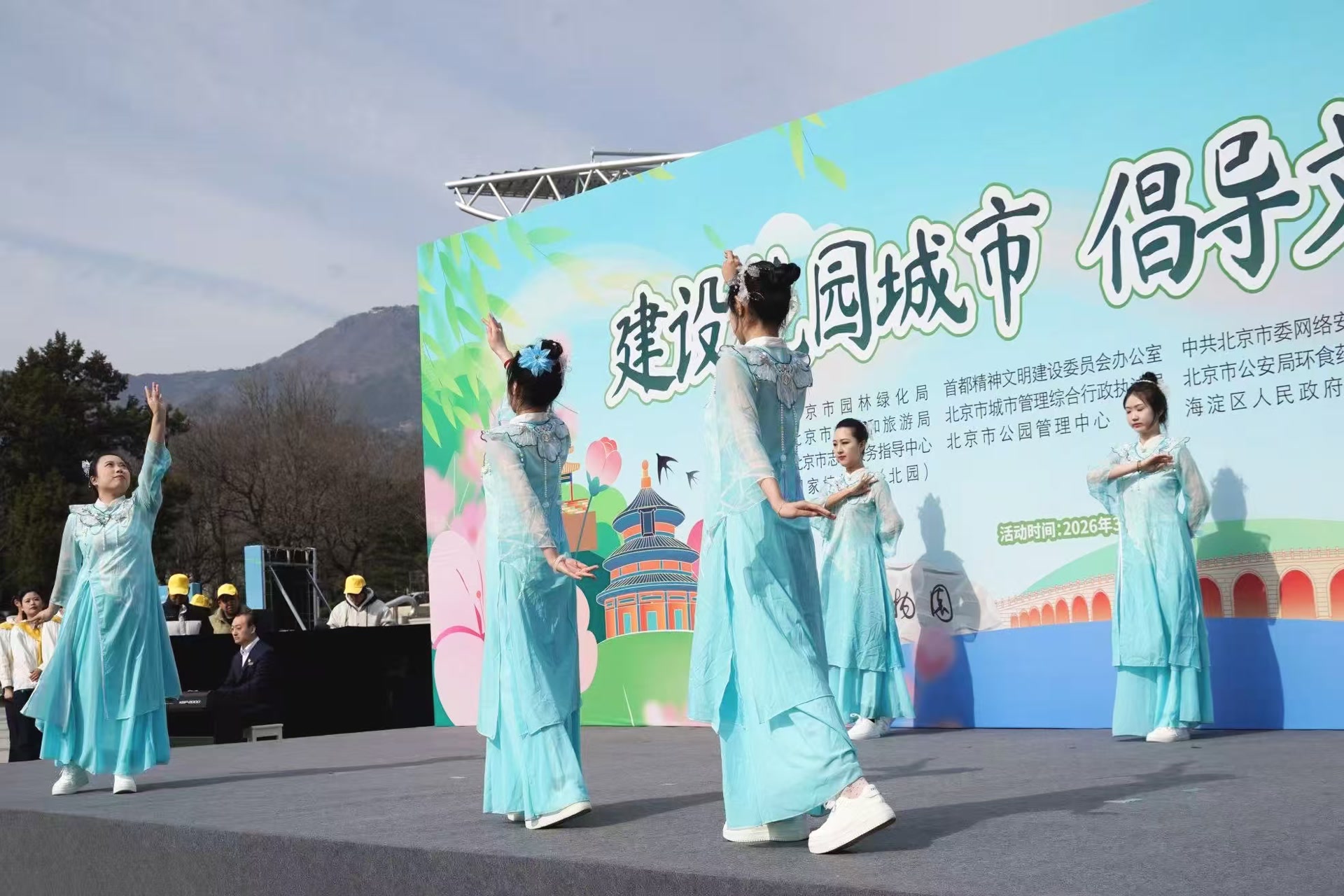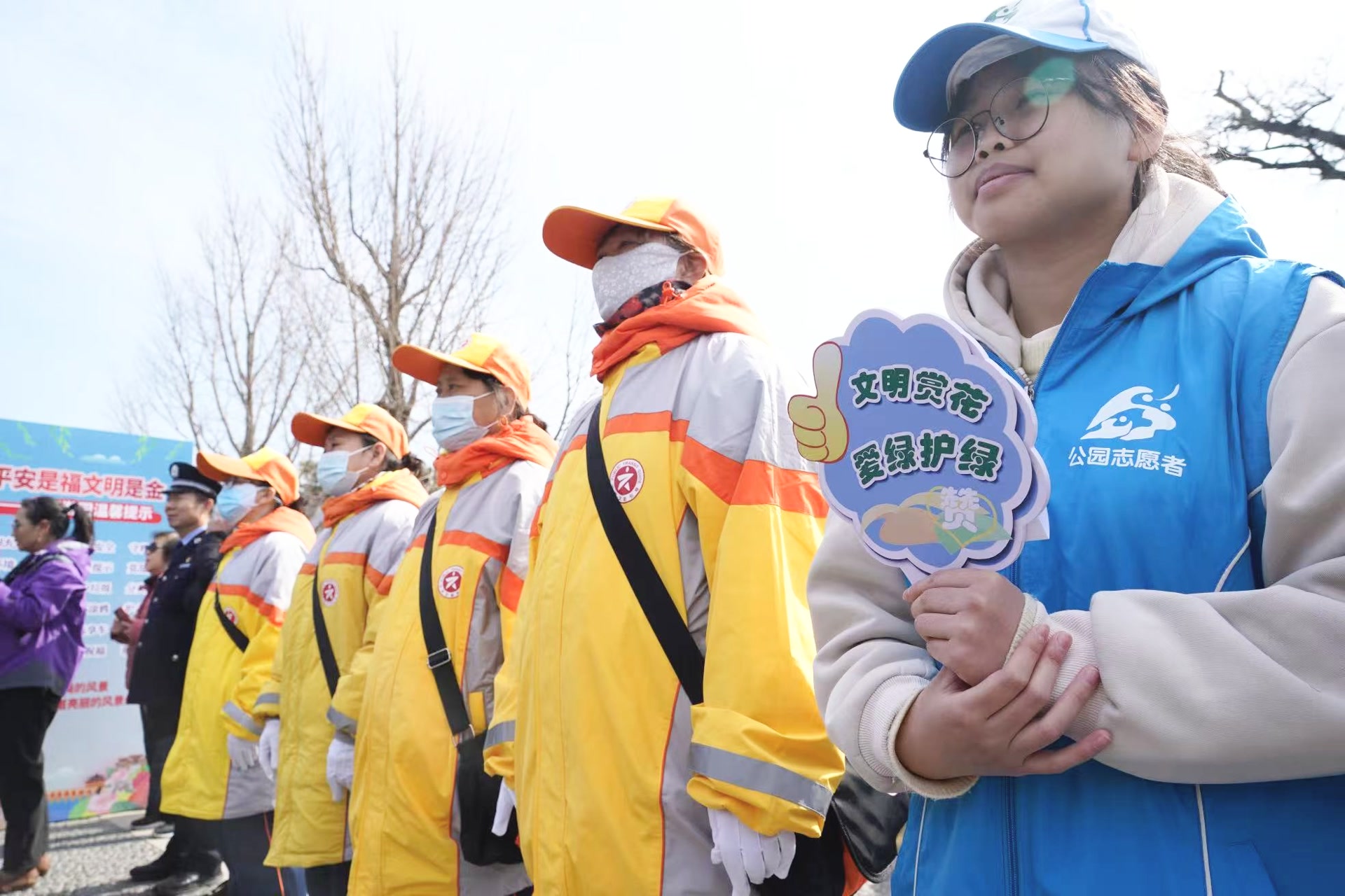 仪式现场,市公园管理中心、市城管执法局面向广大市民游客发出文明游园提示,游客代表宣读《2026年北京市公园游客守则》,共同发出文明游园倡议,号召游客从自身做起,自觉践行文明行为,共同守护绿色家园。