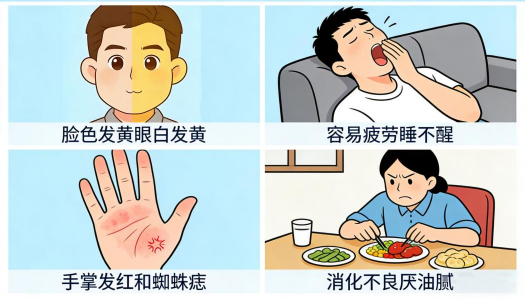 • 皮肤变化:眼白发黄(黄疸)、皮肤瘙痒、面色晦暗(肝病面容);
