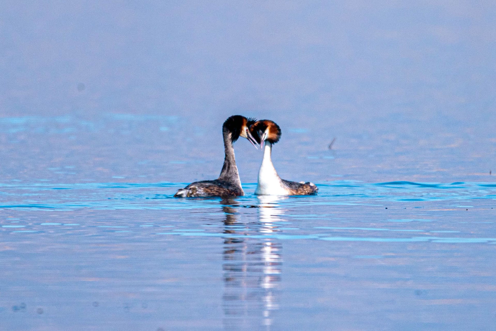 在方春录制的视频里,两只凤头鸊鷉点头鸣叫,时而迅速扭头、左右摆动,时而相对游动、直立撞胸,动作极具节奏感,俨然人类的探戈舞。它们头部的繁殖羽展开时,形成一个圆盘,像打开了一把扇子。
