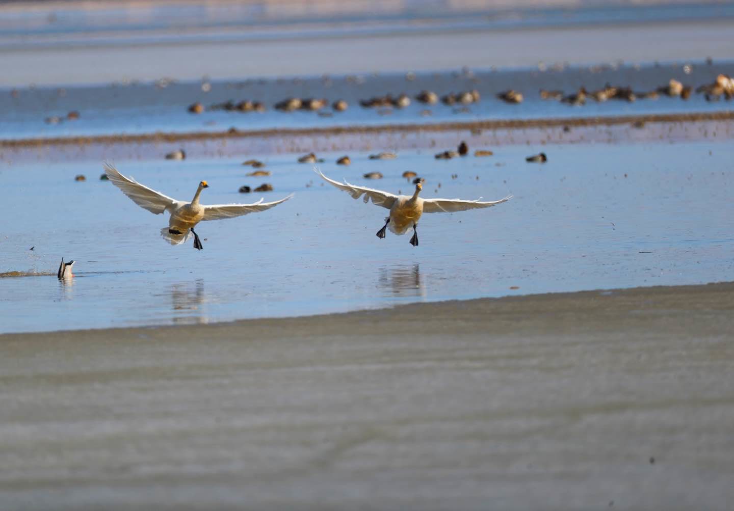 它们经常结对在一起,关系不错,但不能“结婚”。在生物学上,大天鹅与小天鹅存在生殖隔离,无法跨物种繁育后代。但这并不妨碍它们成为迁徙路上的好伙伴。在野鸭湖和官厅水库,大天鹅与小天鹅常常混群活动,在同一片水域觅食,在同一个浅滩休憩。它们都保持着对人类的警惕距离,都遵循着相似的迁徙规律——2月底陆续北归,3月中旬迎来高峰,4月上旬陆续迁离。