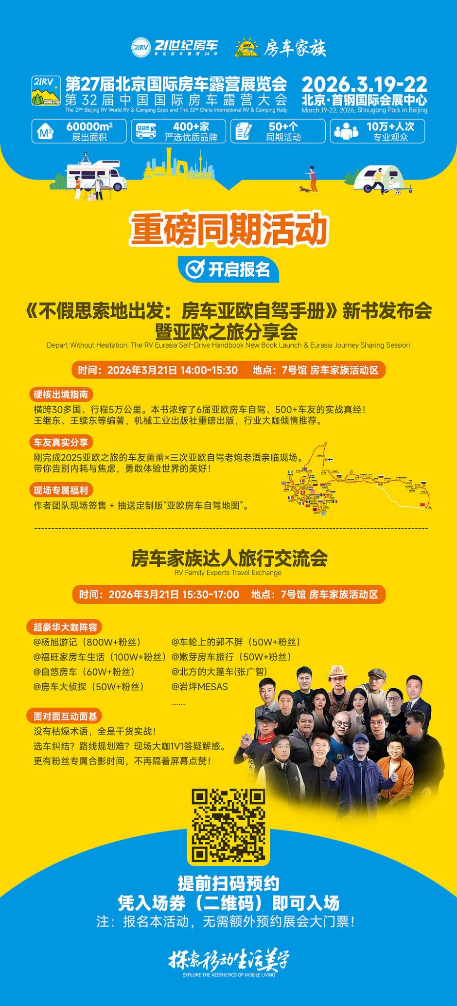 春启新程,逐梦而行!备受行业瞩目的第27届北京国际房车露营展览会暨第32届中国国际房车露营大会,于2026年3月19日至22日,在石景山首钢国际会展中心盛大启幕,邀您共赴一场关于移动生活的美好之约,解锁房车露营的无限可能。