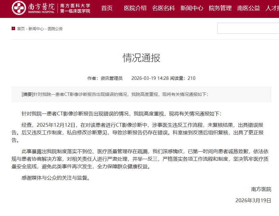此事暴露出我院制度落实不到位、医疗质量管理存在疏漏,我们深感愧疚,已第一时间向患者诚恳致歉,依法依规与患者协商解决方案,对相关责任人进行严肃处理,并举一反三,严格落实各项工作流程和制度,坚决筑牢医疗质量安全底线,避免此类事件再次发生,全力保障群众健康权益。