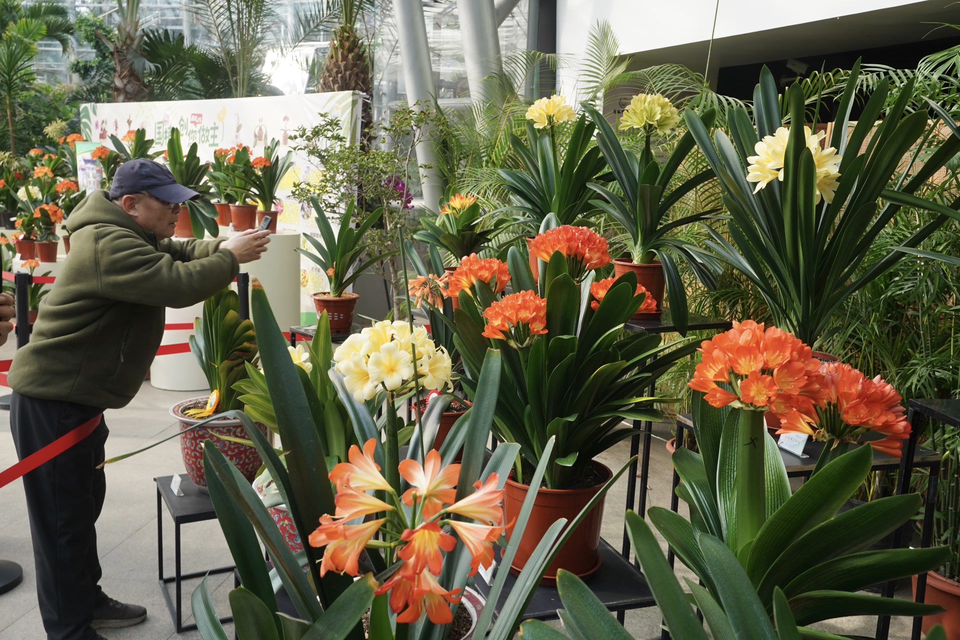 本次展览共展出20余个种(含品种)、100余株君子兰,囊括大花君子兰、奇异君子兰、有茎君子兰等原种,佛光、重瓣牡丹彩、金碧辉煌、凤凰展翅、翡翠屏、黄百合、西芬斯女儿等优秀品种,让游客沉浸式感受其叶形挺拔、花姿端庄的独特之美。
