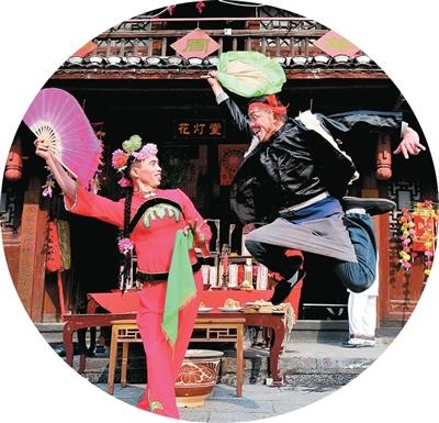 何建勋(右)在表演花灯。唐 磊摄