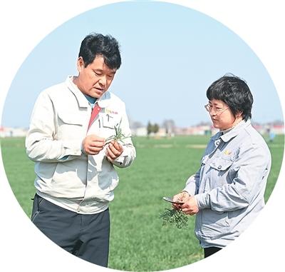 常清(左)在查看小麦的长势。陈 雷摄