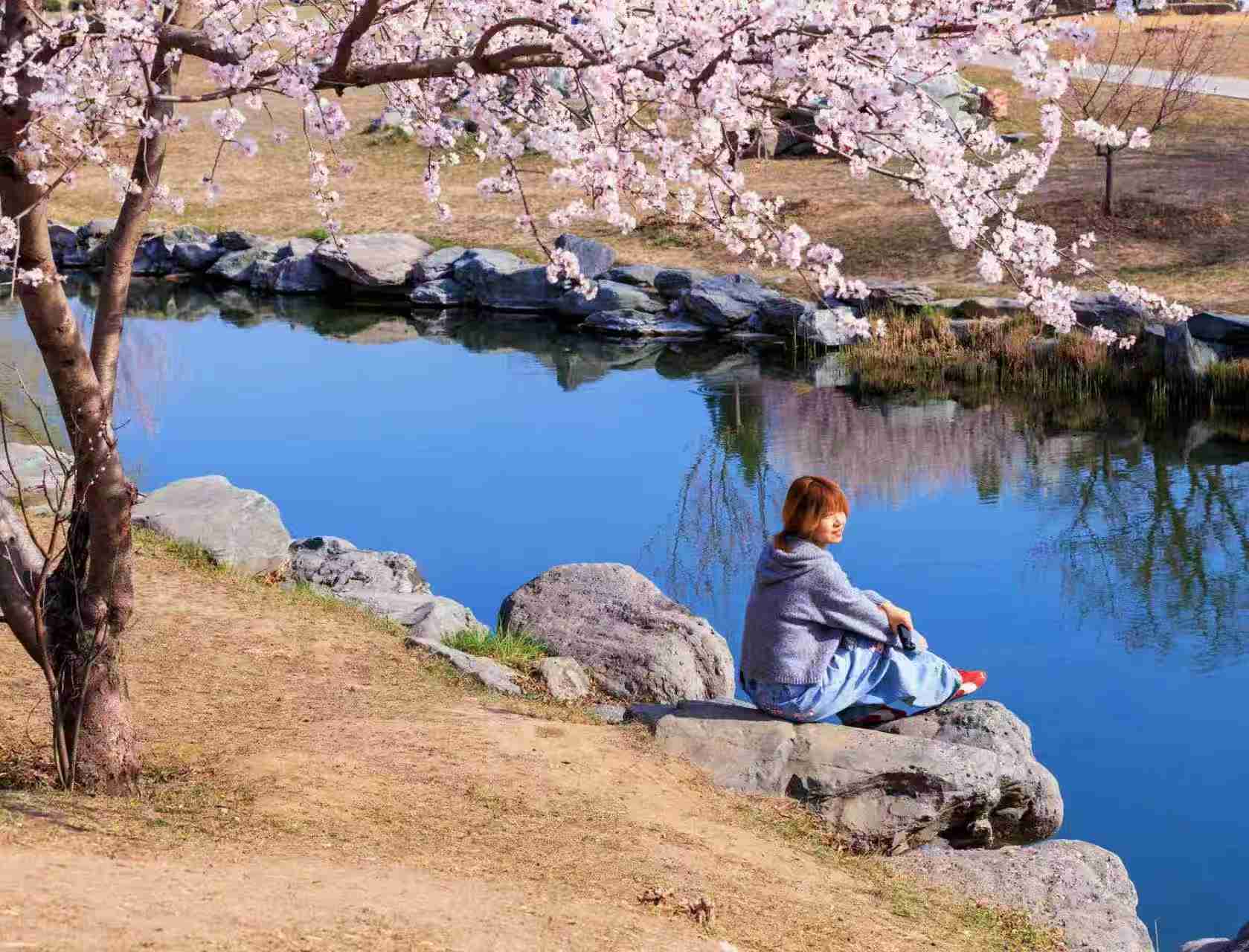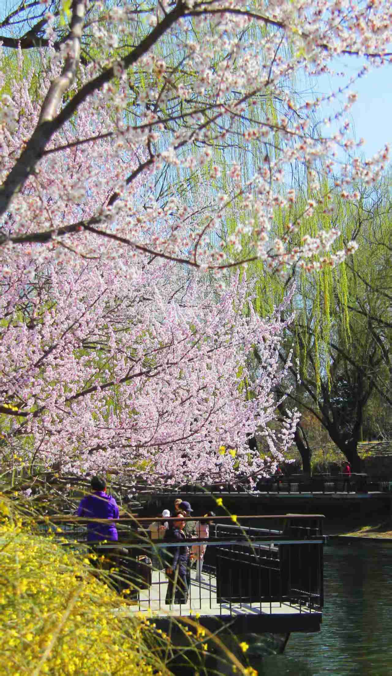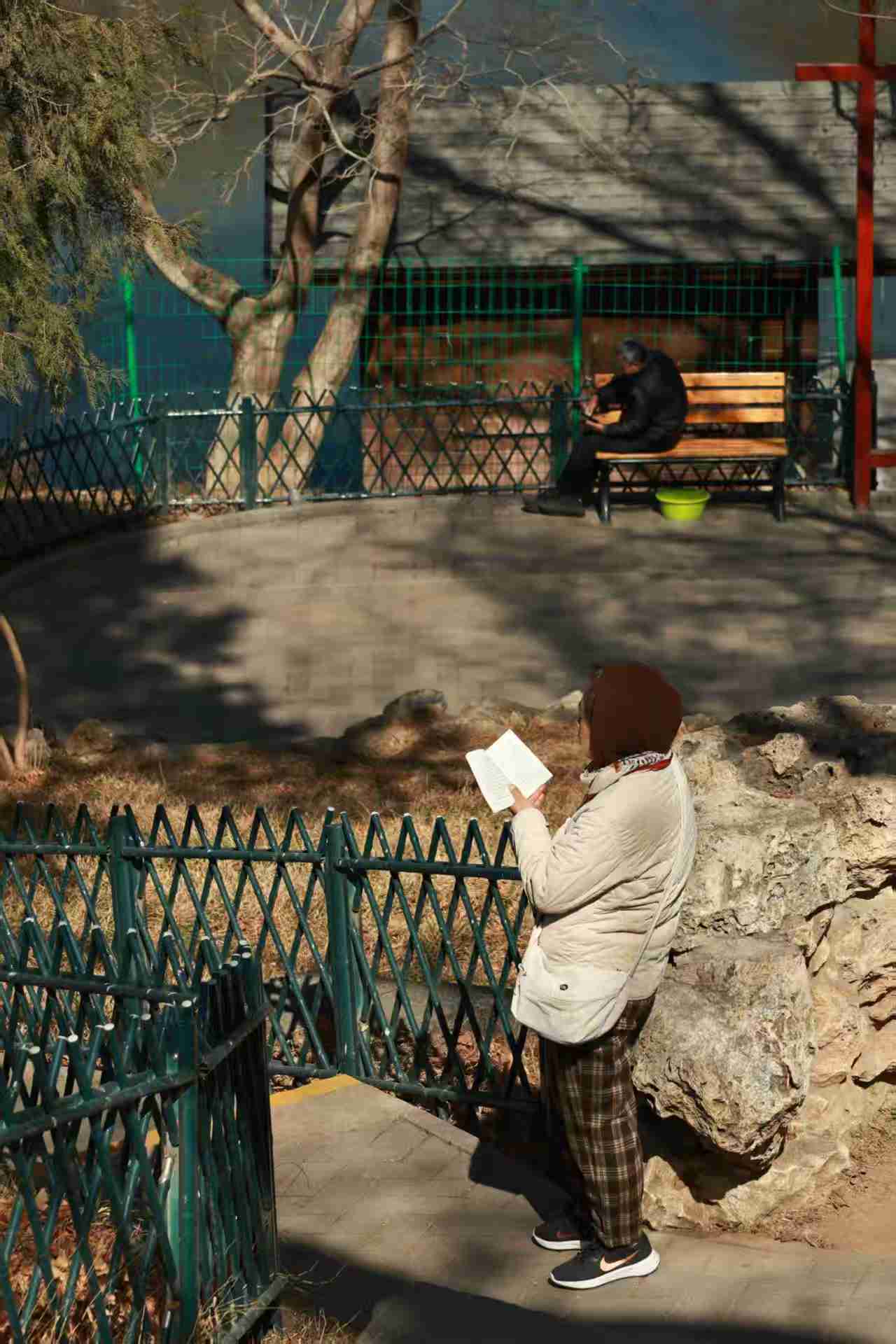 在紫竹院公园看到一位读书的姐姐,而离她不远处有一位坐着休息玩手机的大哥,一站一坐,一个读纸质书、一个看手机,也是春天里的自得其乐。