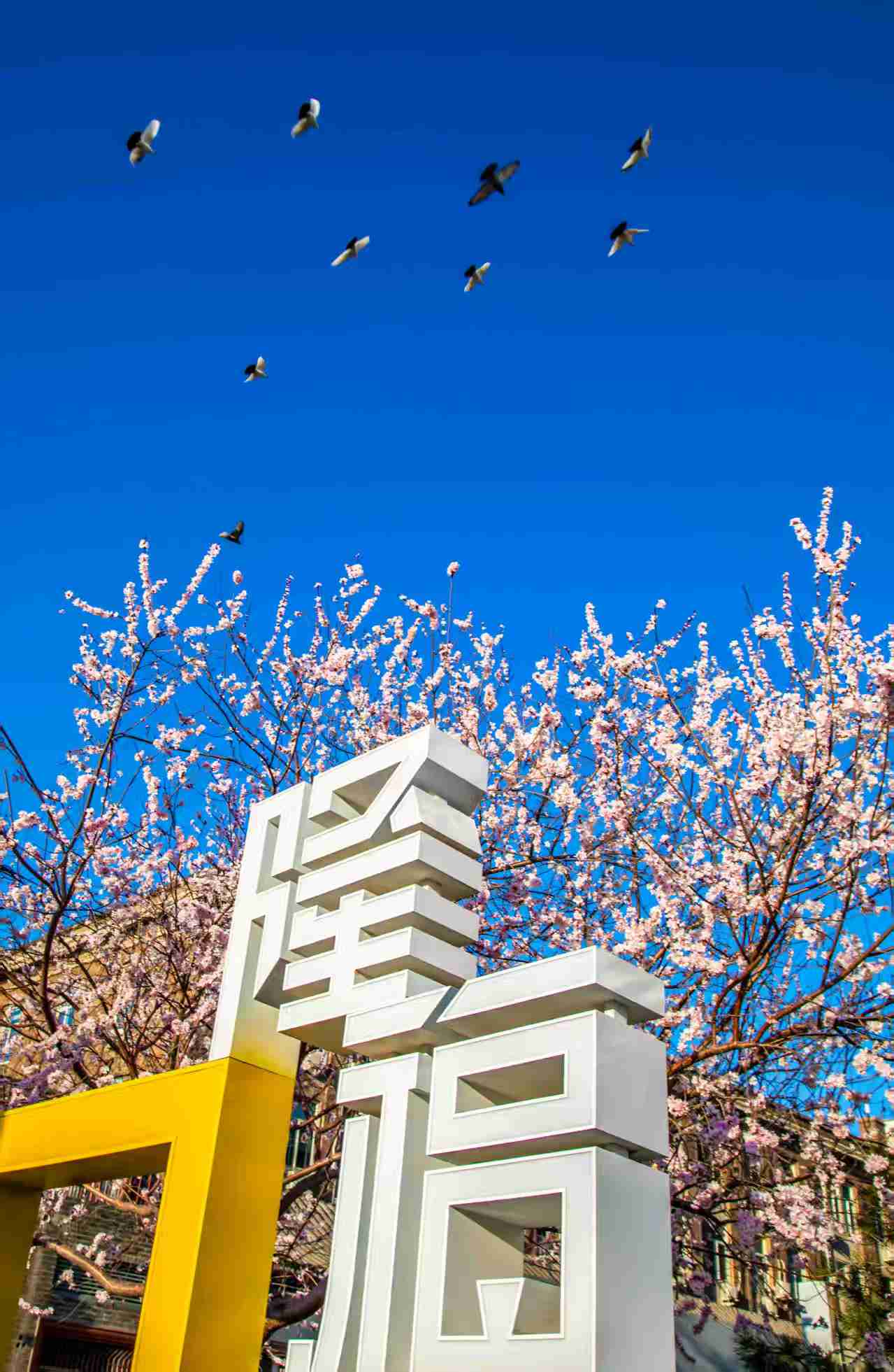 桃花缀满枝头,鸽群划破湛蓝晴空,春天来到了隆福。