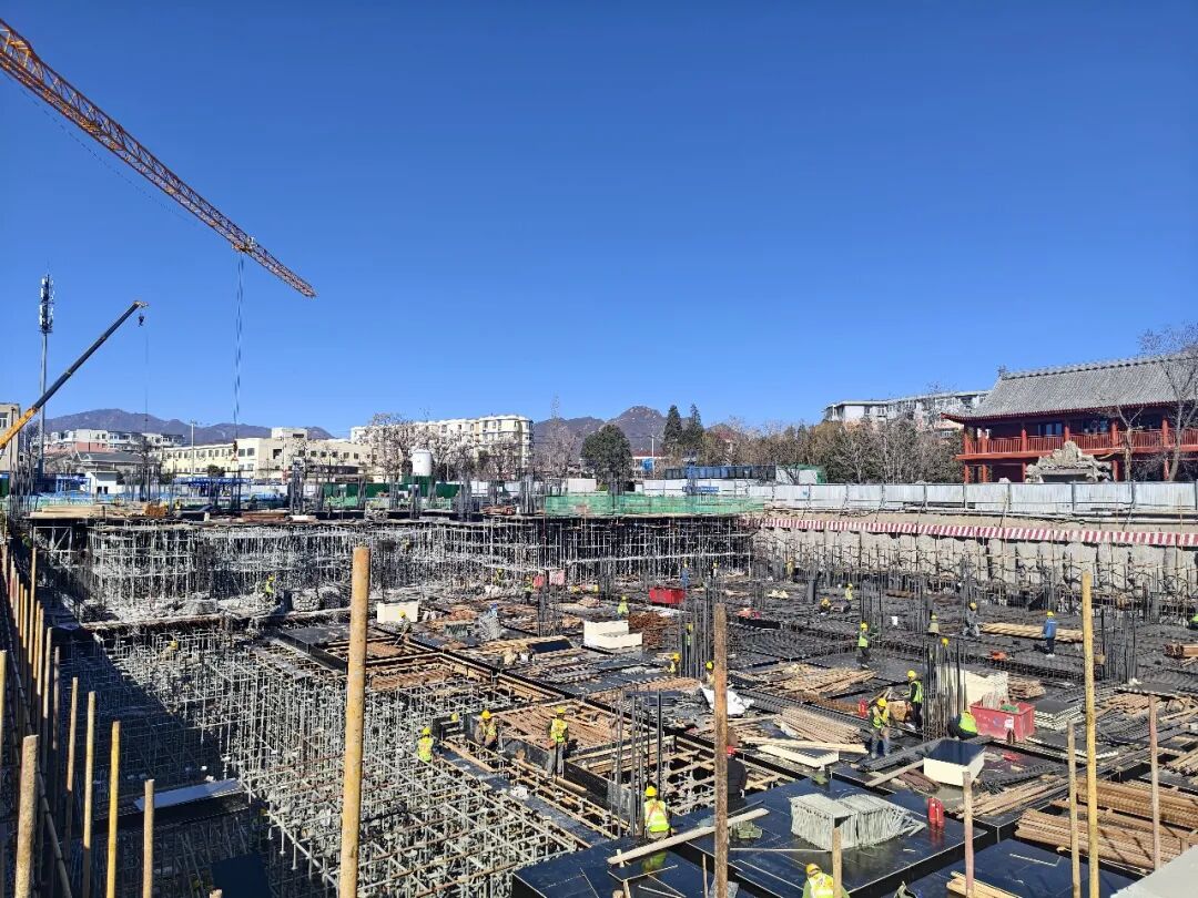走进清华南口国重基地项目三期施工现场,这里塔吊轮转、机械轰鸣,170余名工人正在主体结构施工面上分工协作、有条不紊地开展着钢筋绑扎、地下室顶板安装等作业,处处洋溢着争分夺秒的建设热潮。