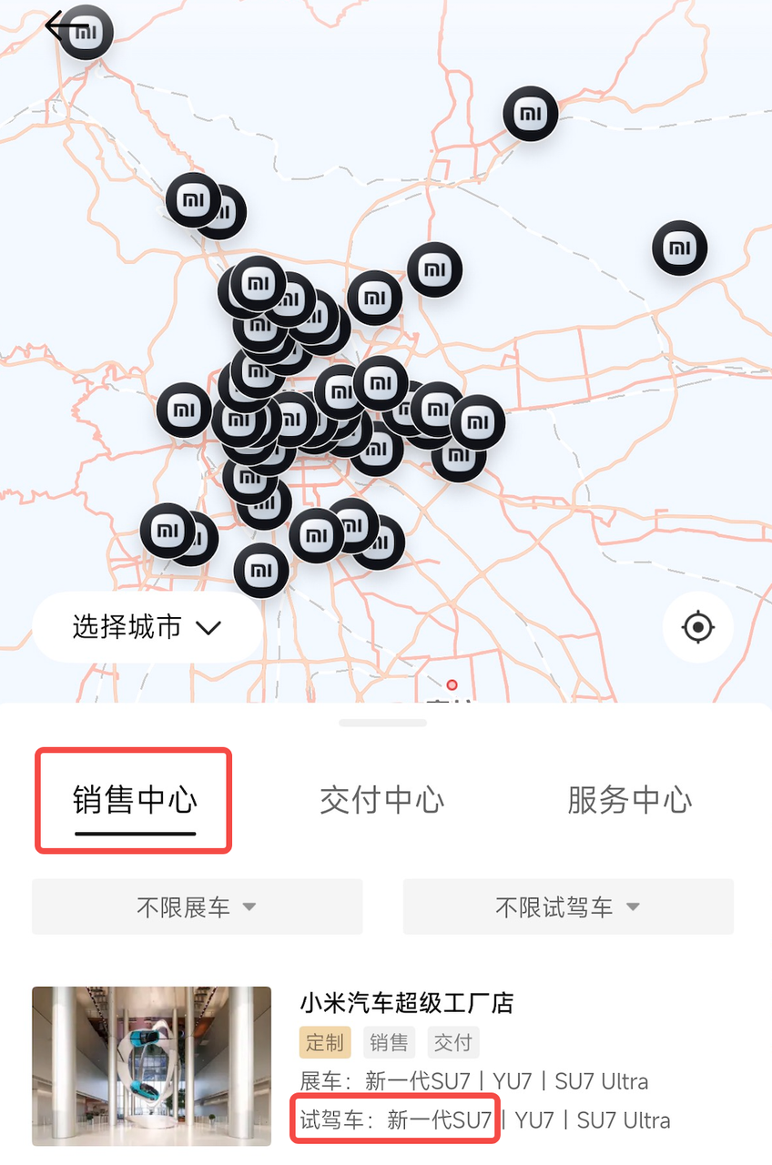 新一代SU7已在3月20日上午8:00开启试乘试驾服务,您可以进入小米汽车APP-附近门店-销售门店-筛选新一代SU7试驾车,或在门店列表中查看试驾车一栏是否有新一代SU7,即可了解可提供试乘试驾的门店,您可在APP点击“去预约”,或联系您的销售顾问进行预约;
