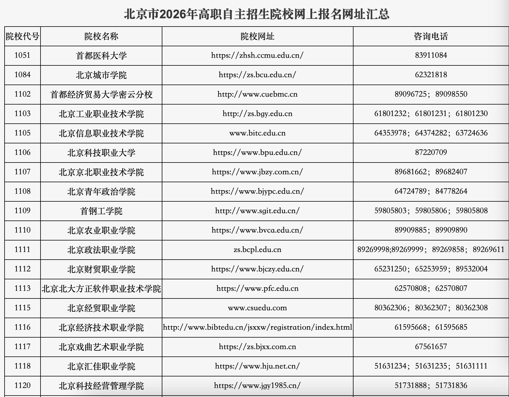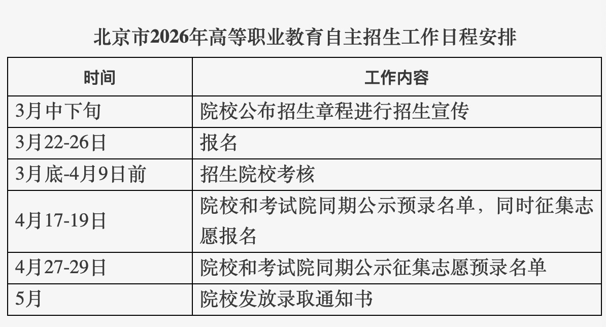 3月22日至26日,北京市2026年高等职业教育自主招生报名进行。已参加北京市2026年高考报名的统考考生和单考考生均可报名参加。每名考生限报一所院校。