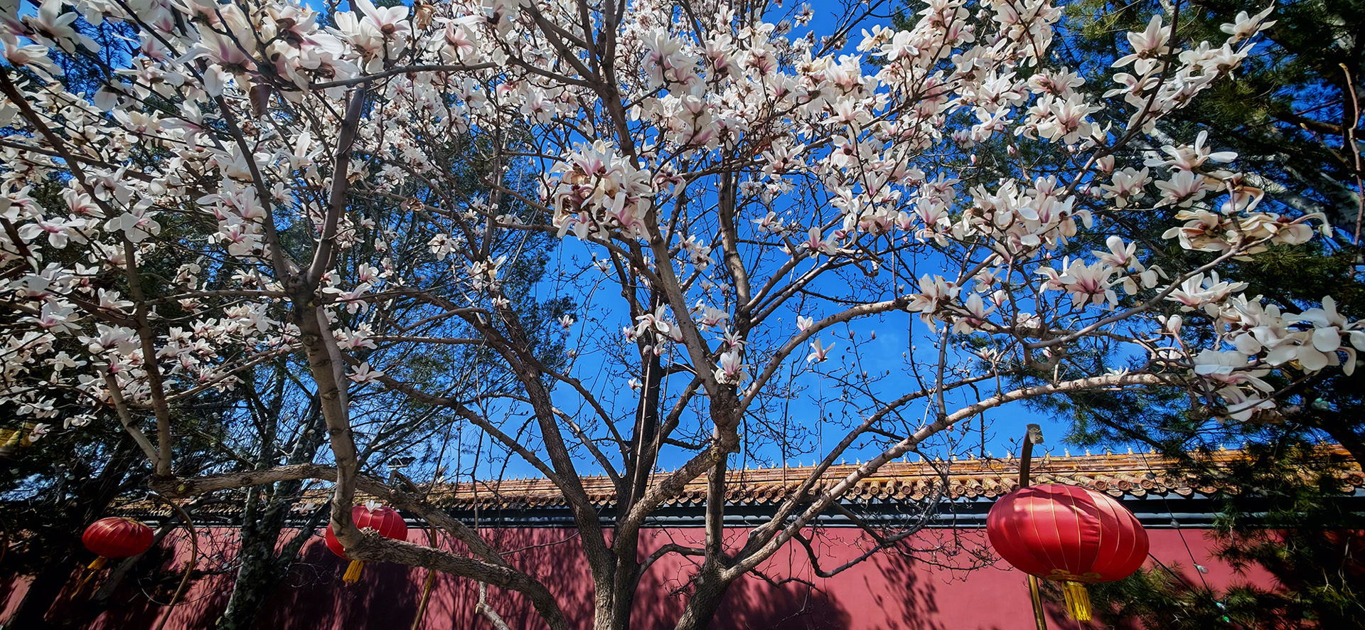 透过相机镜头,我看到画面里新雪似的玉兰衬着经年的红墙,古老与新生、庄严与烂漫,融为一体,真正的恰到好处。