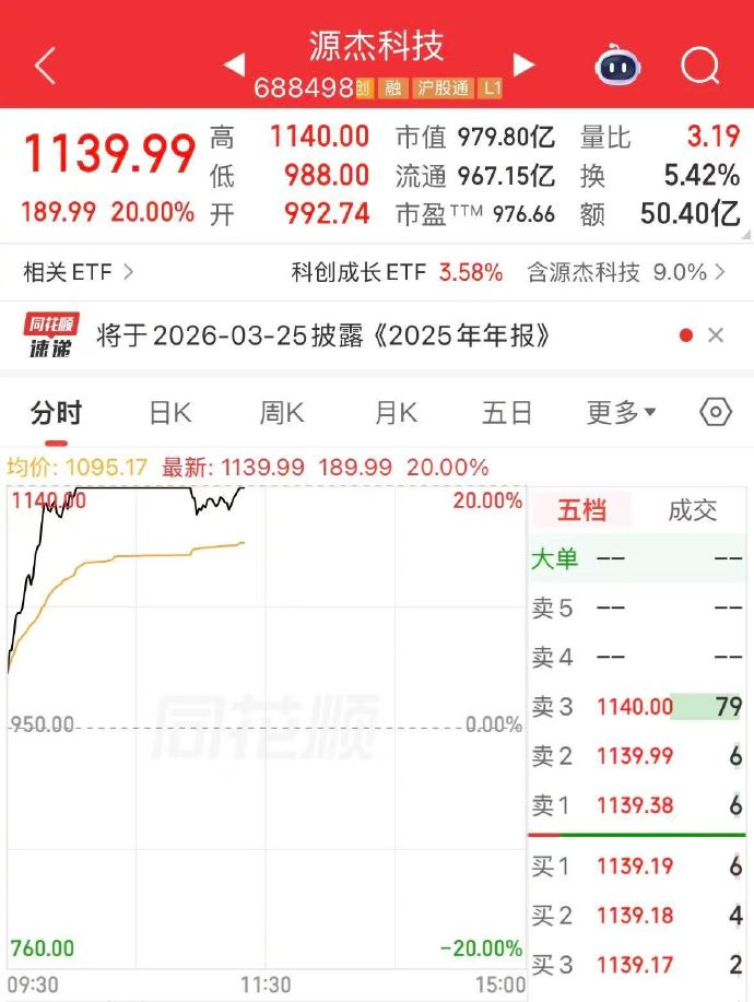 3月20日,光芯片龙头源杰科技盘中股价接连突破1000元、1100元关口,并触及20%涨停,正式迈入“千元股”行列,成为A股历史上第八只千元股。与此同时,公司股价超越寒武纪,跃居A股第二高价股。
