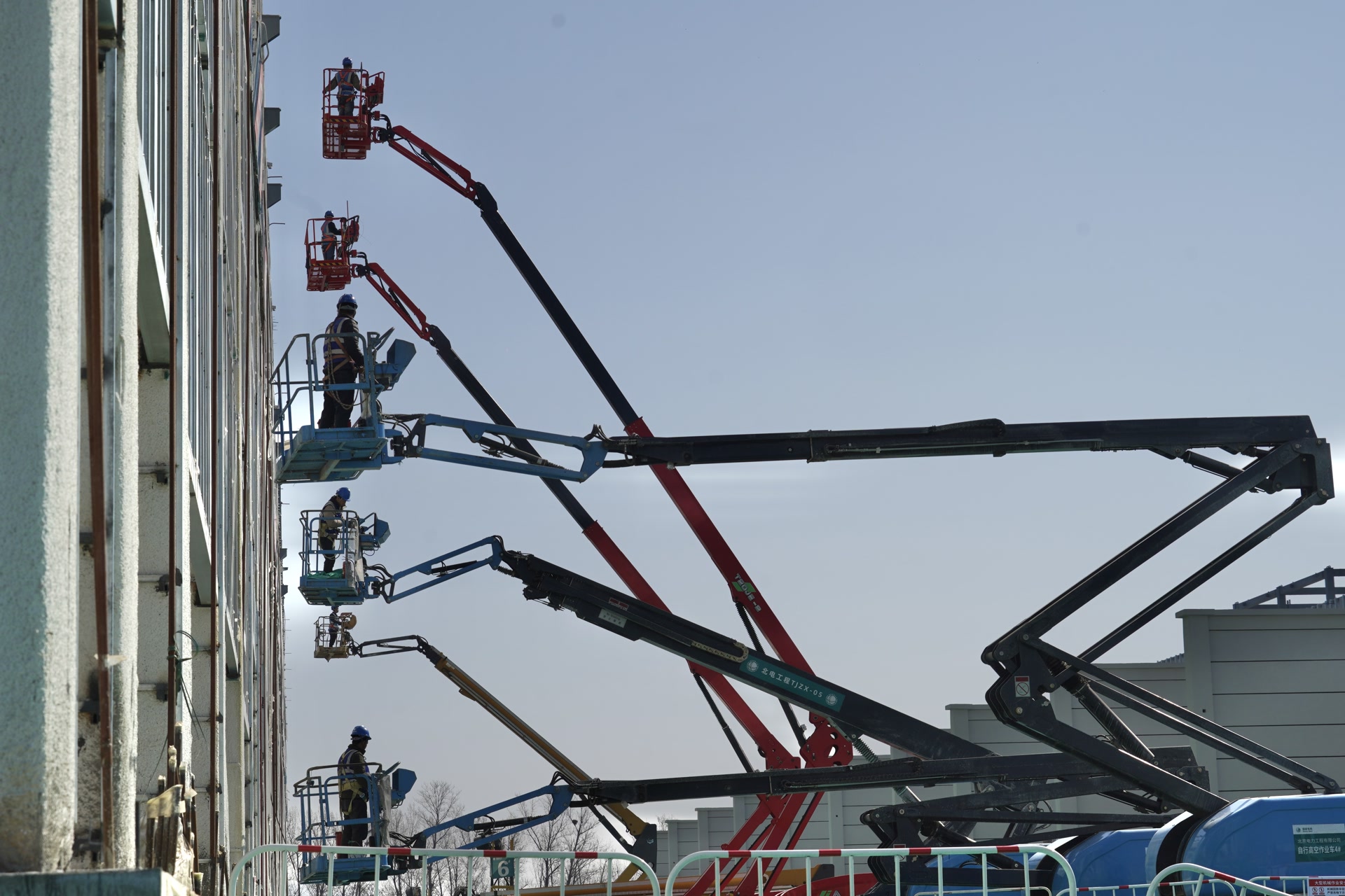 在北京怀柔科学城500千伏输变电工程现场,曲臂车伸出长长的“臂膀”,将建设人员送到高空中,展开外立面安装工作。“有了曲臂车,外立面施工过程便不再需要搭设脚手架,大幅提升施工效率的同时,还实现安全防护、施工进度与绿色建造水平同步提升。”北京电力工程有限公司施工项目经理王涛介绍。