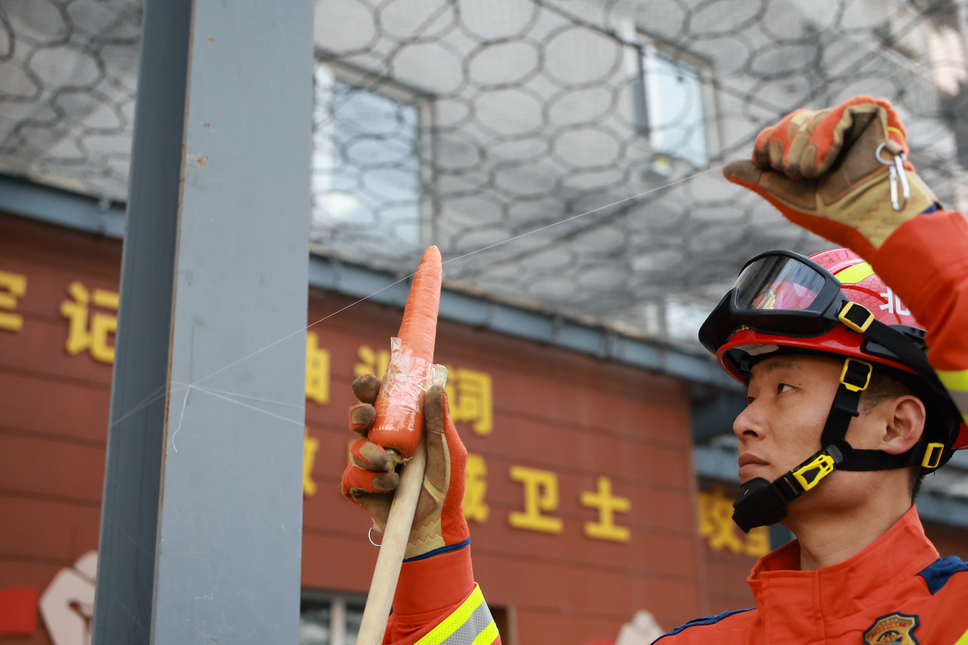 接下来,消防员手举黄瓜、胡萝卜、鸡胸肉和猪肉逐一进行实验。实验中,白色线和彩色线虽然拉力不同,但杀伤力都不容小觑。