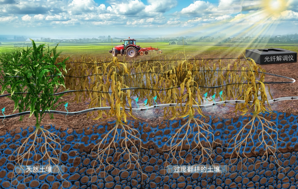 为实现可再生农业,农学家一直在探寻有效方式评估耕作对土壤结构的影响。针对这个难题,研究团队利用分布式光纤技术,在不破坏土壤的前提下,实现了连续、高分辨率的实时监测,通过记录大地背景噪声产生的地震波来分析土壤结构变化。