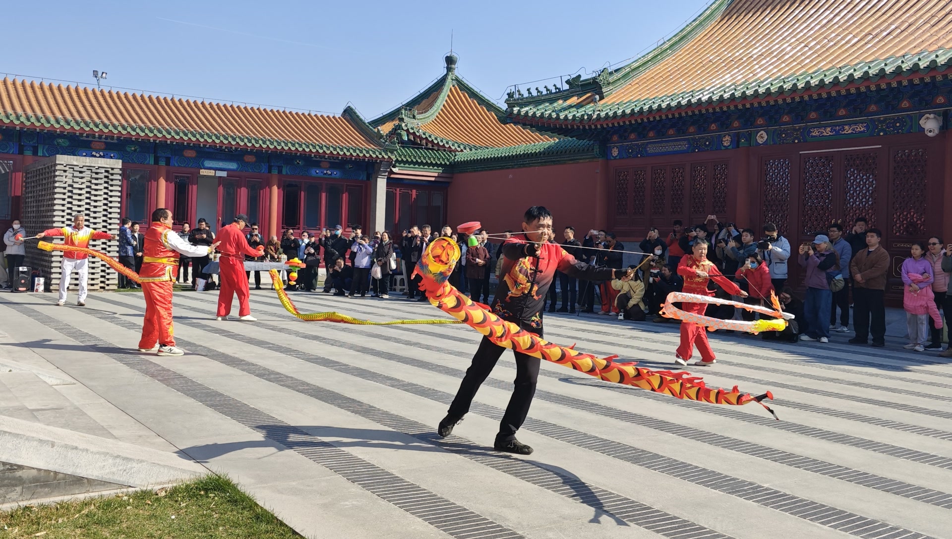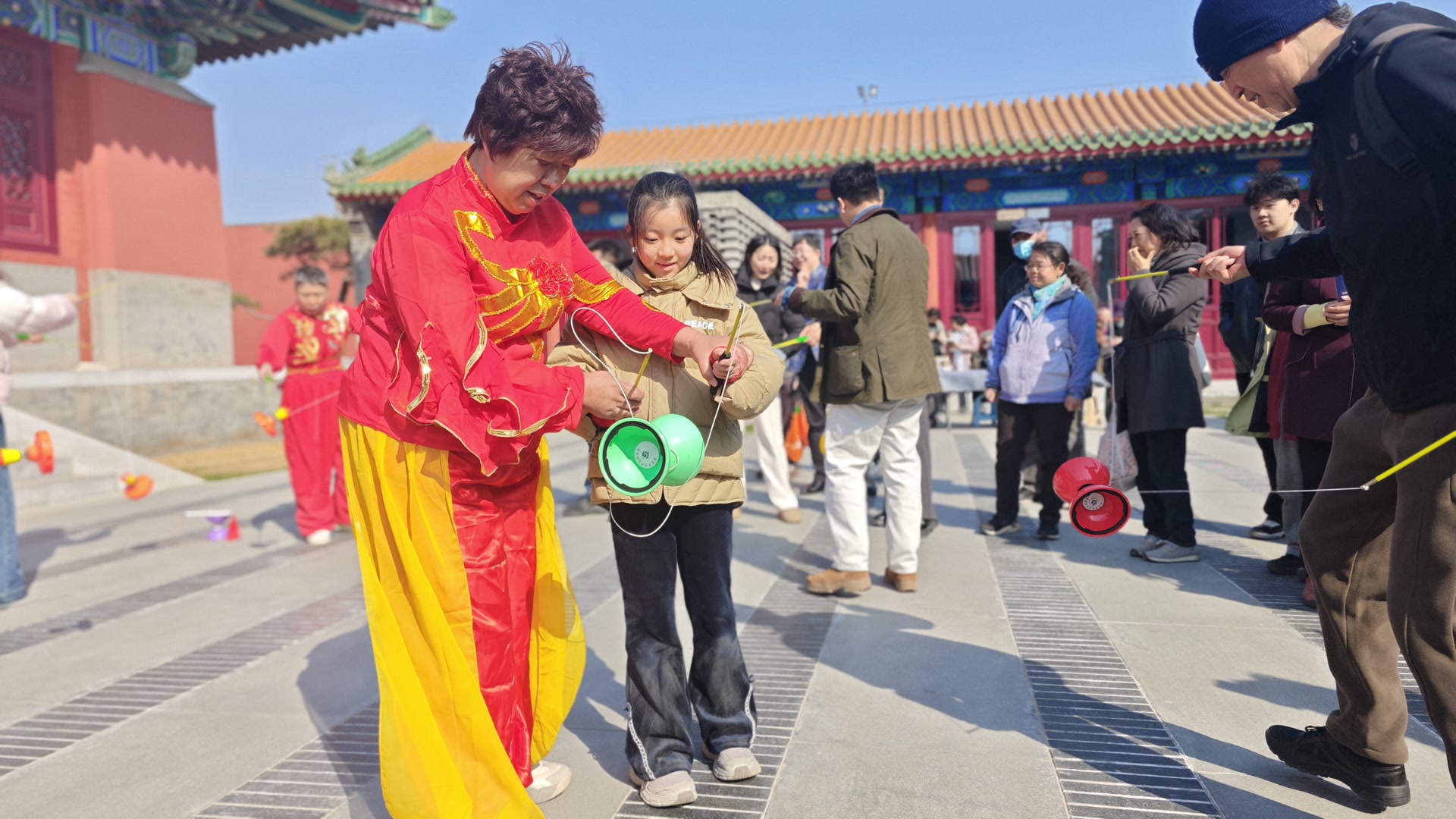 今天,在春分遇上“龙抬头”的特别日子里,由北京市体育总会指导,北京市空竹运动协会、景山街道文联主办的“京韵抖空竹·福满北京城”非遗空竹展演系列活动在东城区隆福寺热闹开场,为市民游客奉上了一场“京味儿”十足的视觉和技艺盛宴。
