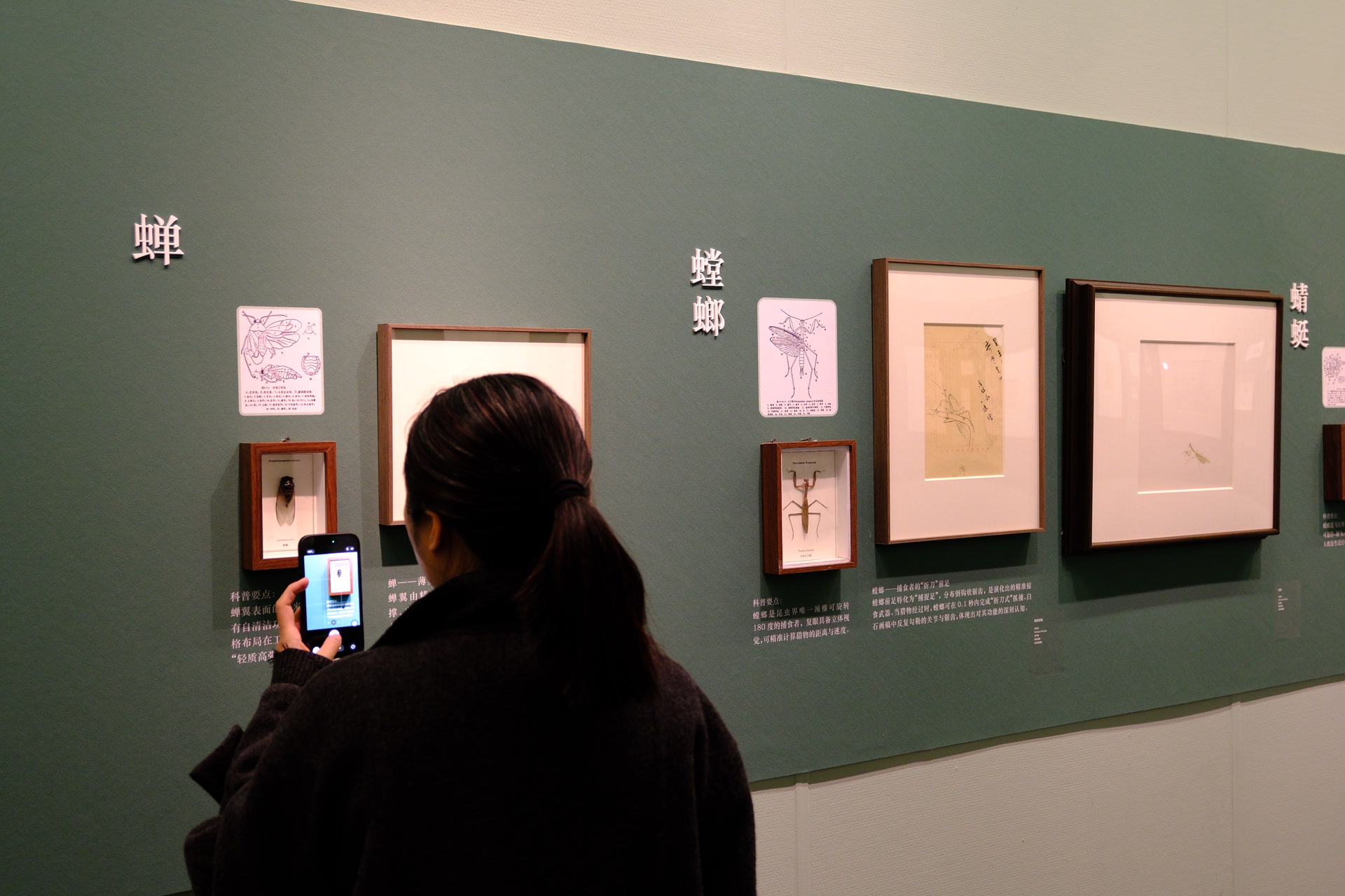 走进展厅,每位观众可领取一本田野考察手册,在观展中仔细寻觅作品中的“蛛丝马迹”,追随画家“观虫”的脚步,按下墙上的按钮聆听虫鸣,体验田野考察的乐趣。在“千年一瞥”单元,展览从命名与认知入手,追溯古人如何为万物命名、如何以图像描绘世界。展出的东晋郭璞《尔雅音图》(清印本)及齐白石多种草虫画稿,生动揭示了昆虫如何从博物分类走向艺术形象,展现了古人观物取象的智慧与情怀。