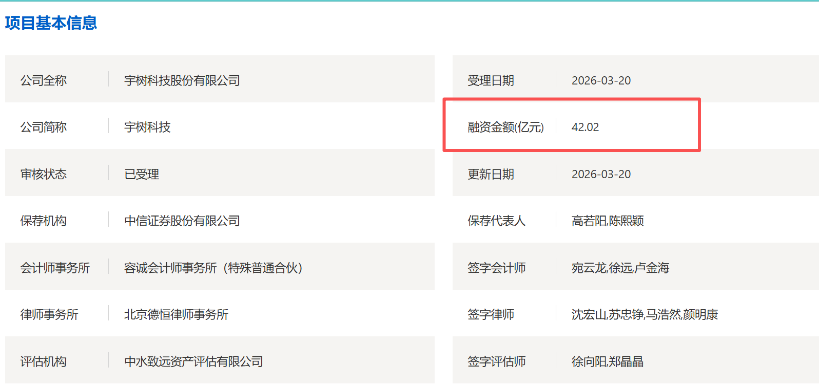 3月20日,上海证券交易所官网显示,宇树科技股份有限公司(宇树科技)科创板IPO已获受理,融资金额为42.02亿元。