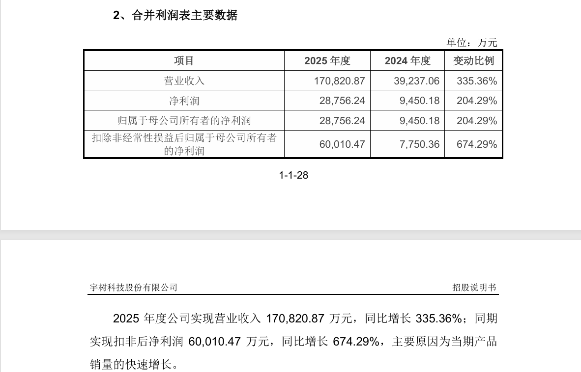 最近几年,宇树科技经营业绩稳步增长,2025年在扣非后净利润迅速增长的前提下,还实现了人形机器人出货量全球第一。公司披露的招股说明书显示,2025年度公司实现营业收入170820.87万元,同比增长335.36%;同期实现扣非后净利润 60010.47万元,同比增长674.29%,主要原因为当期产品销量的快速增长。