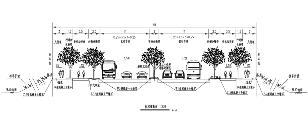 项目整体建成后,道路将升级为标准四幅路布局:中间设置2米中央分隔带,两侧各设11米机动车道,并依次布置2.5米分隔带、3.5米非机动车道、1.5米绿化设施带及3米人行道。通过科学合理的功能分区,实现机动车、非机动车与行人物理隔离、各行其道,从源头破解混行难题,显著提升通行能力、通行效率与出行安全性。