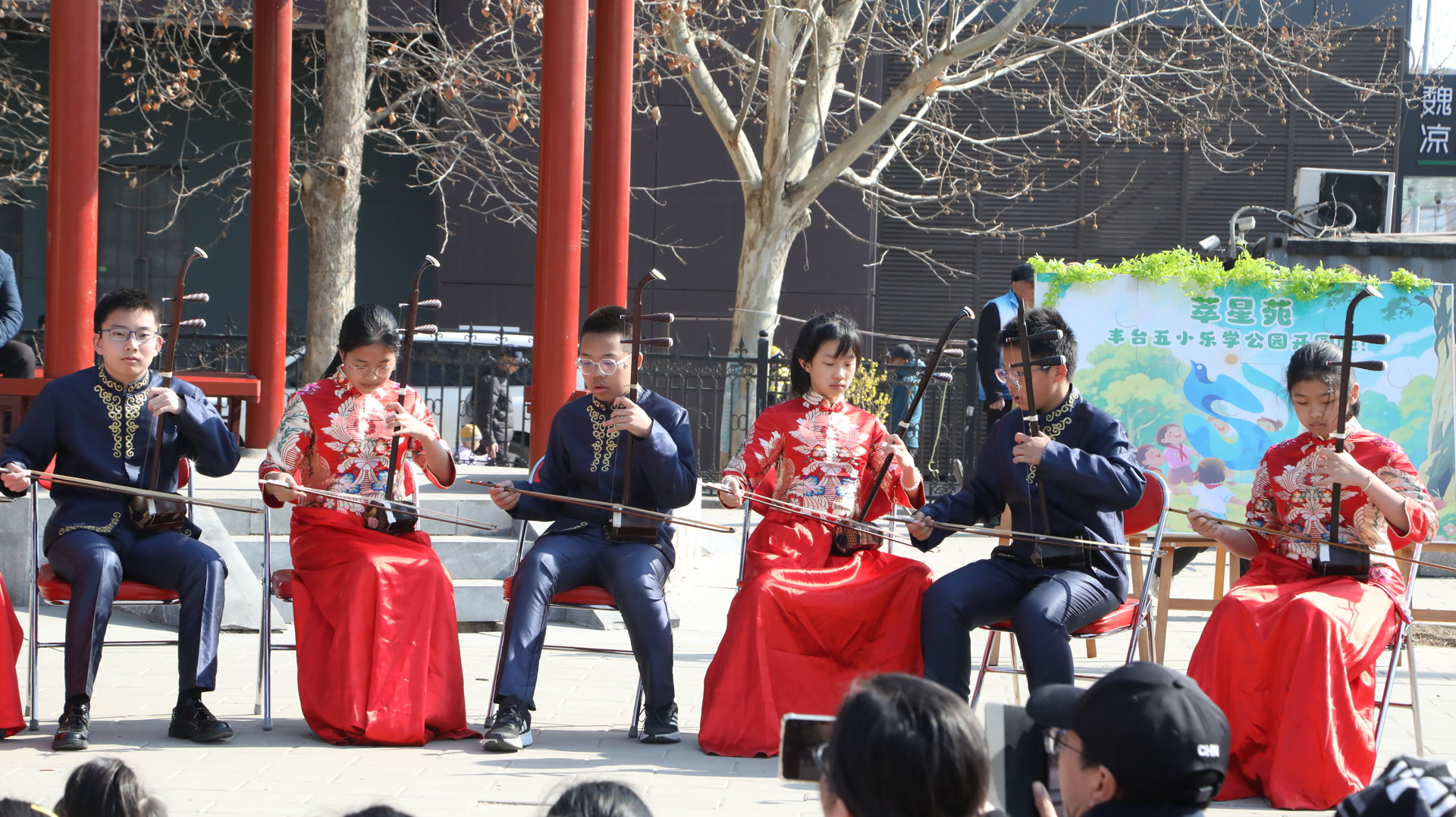3月20日,丰台区第五小学在该校乐学公园“萃星苑”举办了一场春分诗歌音乐游园会。孩子们与社区文艺团体联袂登台,用歌声、朗诵、器乐、戏曲,把春天唱进风里、读进诗里。
