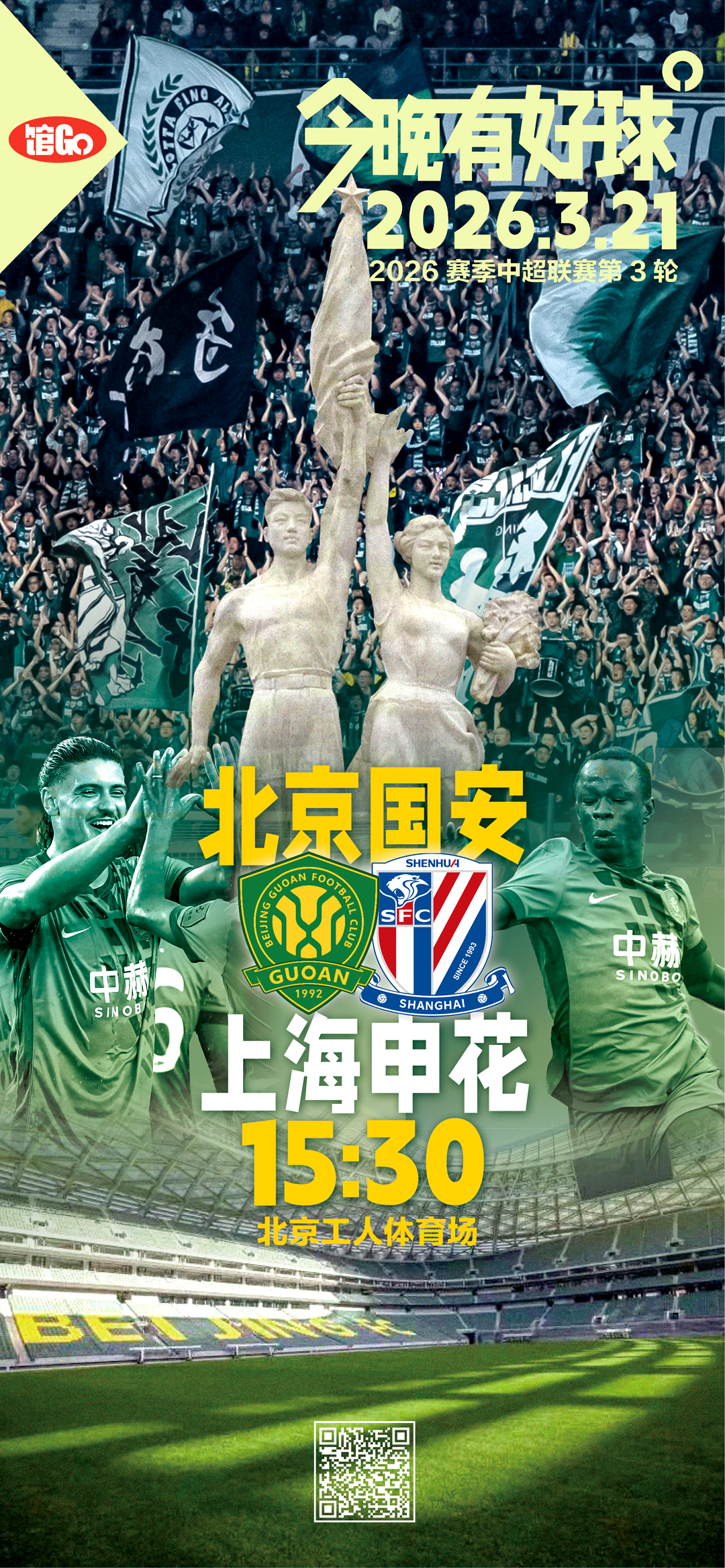 北京国安队将在2026赛季中超联赛第3轮比赛中主场迎战上海申花队。