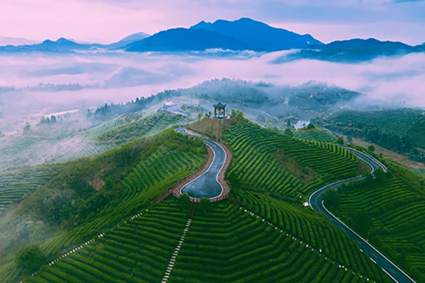 在江西省宁都县钓峰乡千亩茶山,晨雾漫过连绵起伏的茶山,与村庄、河流、村道相映成景,构成一幅生态优、产业兴、乡村美的新农村画卷。(江西省宁都县纪委监委供 严振宁 摄)