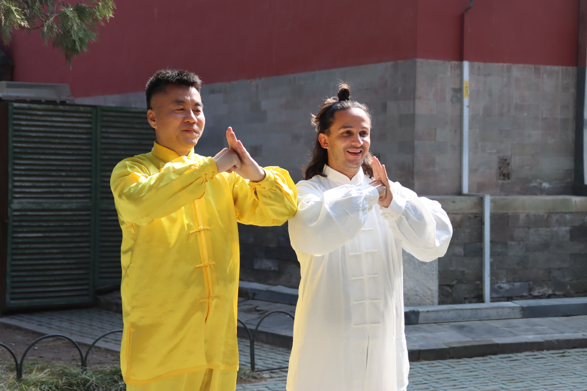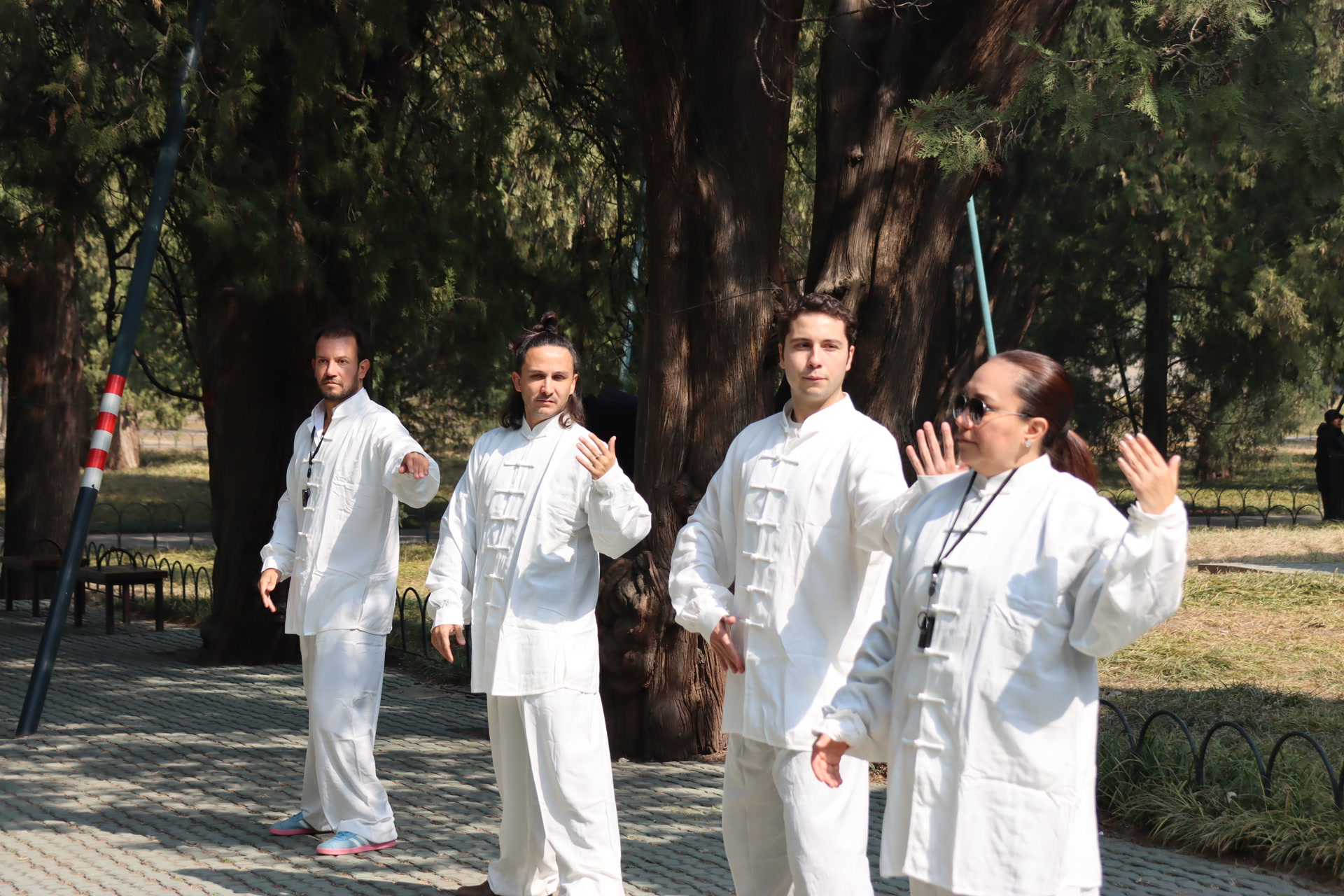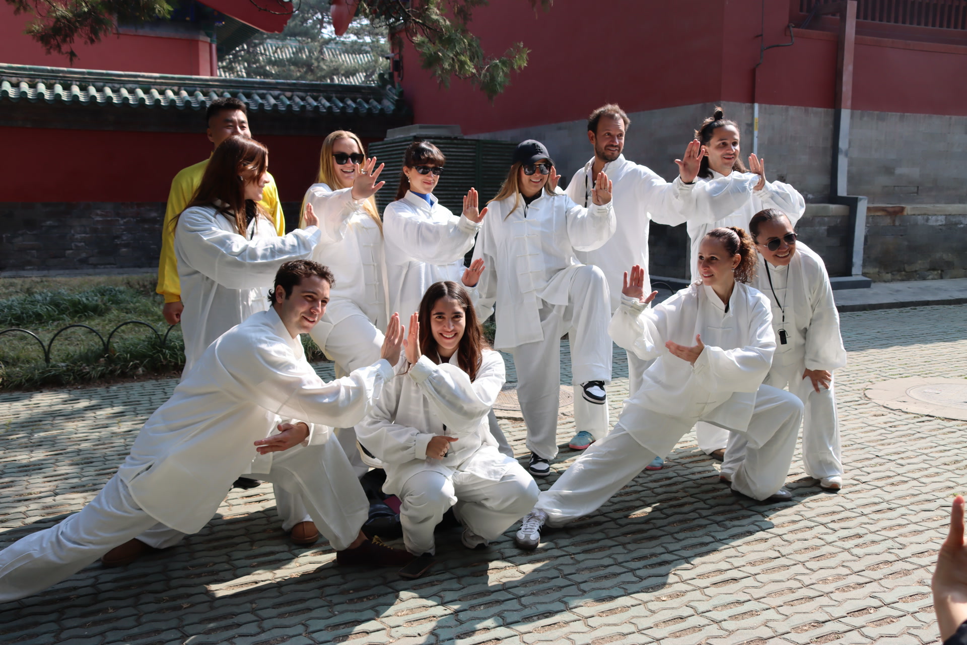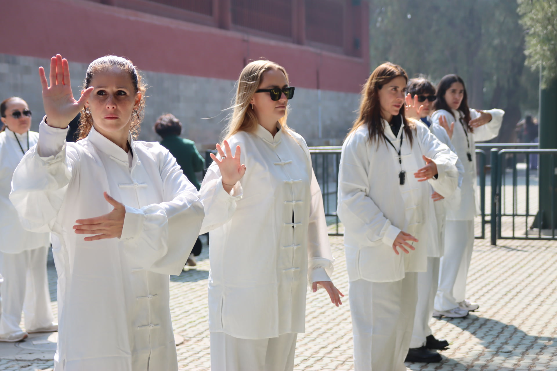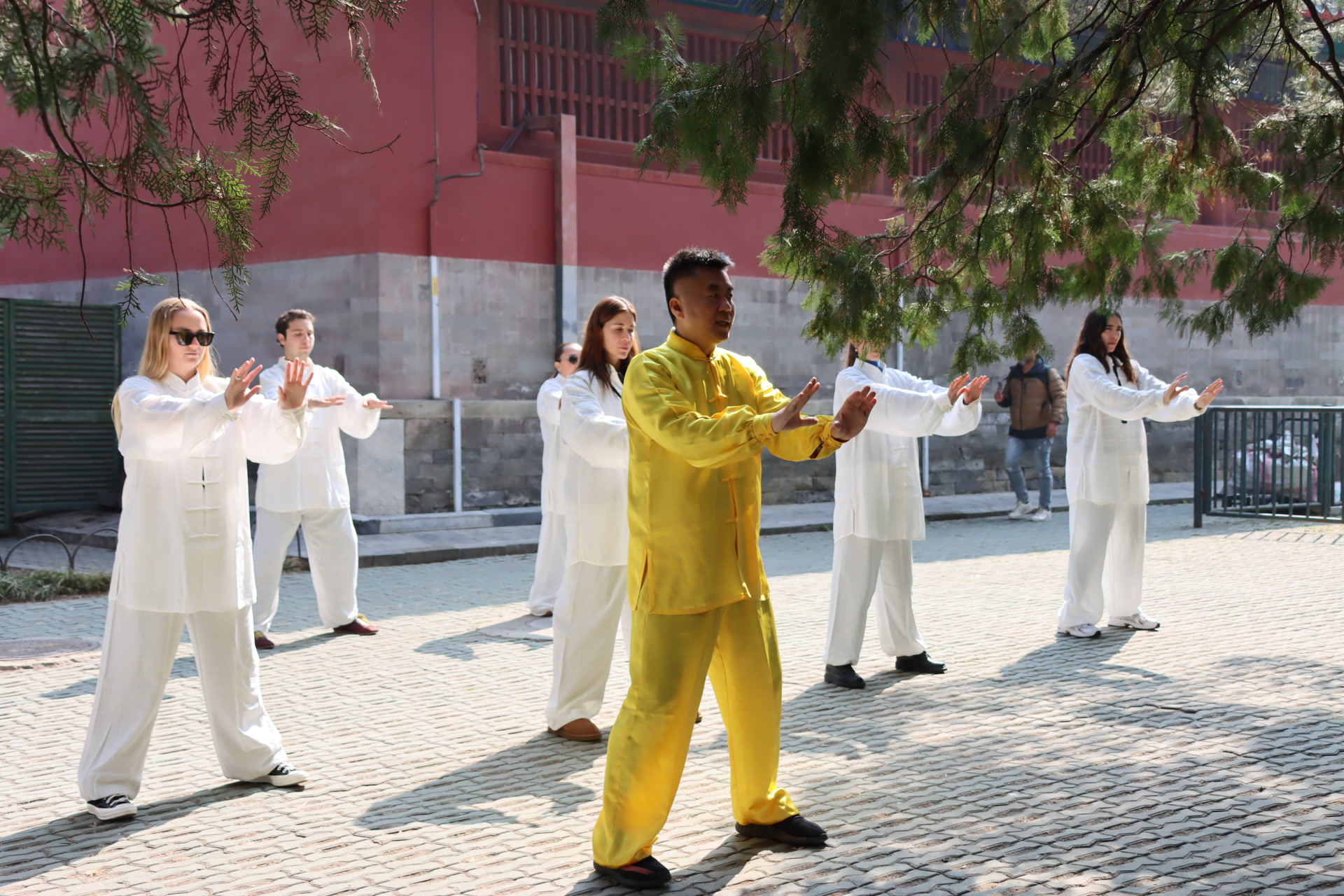 祈年殿东侧古柏掩映,红墙在阳光照耀下古朴厚重。有一群身着统一白色练功服的外国游客,正在这里进行一堂太极体验课。