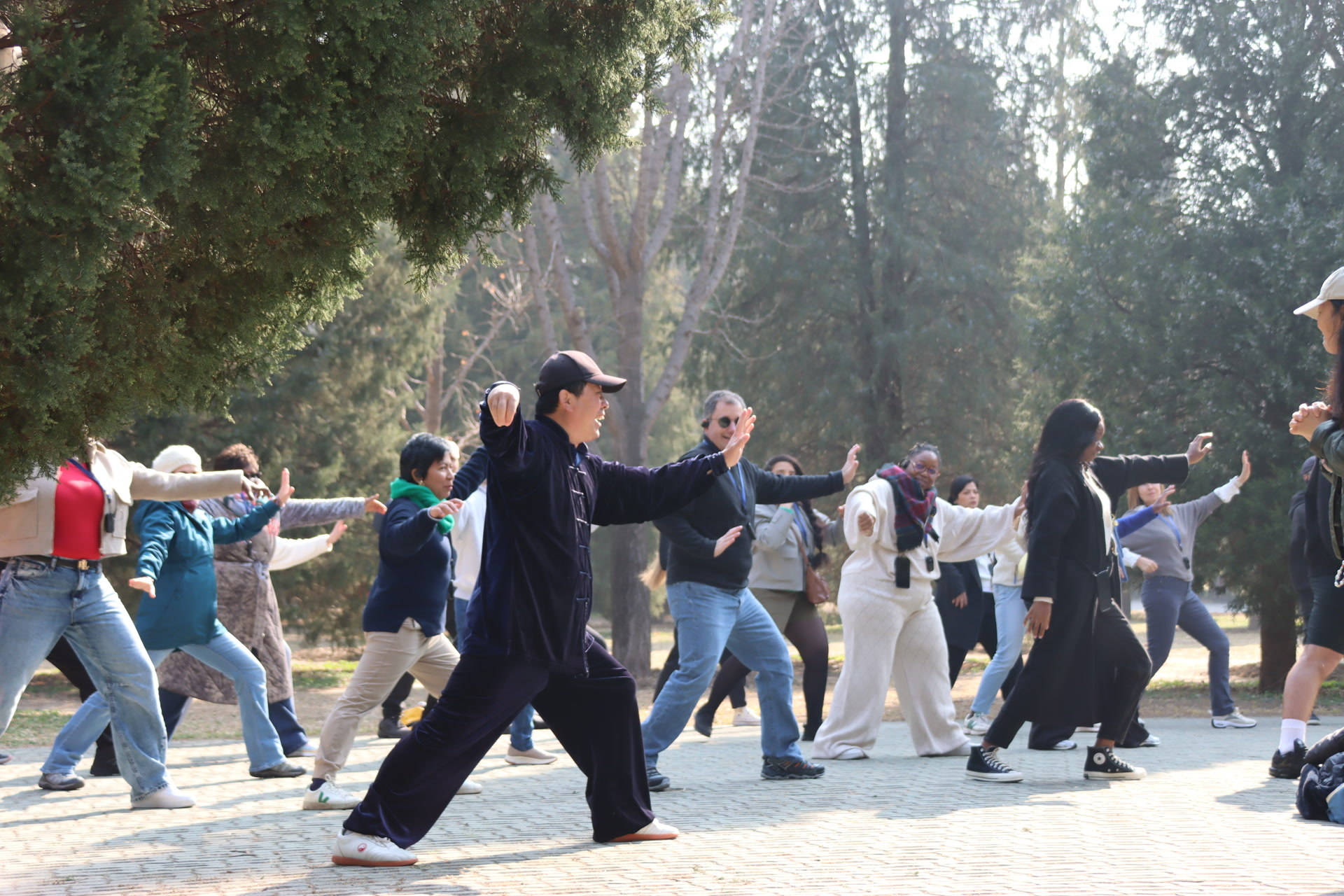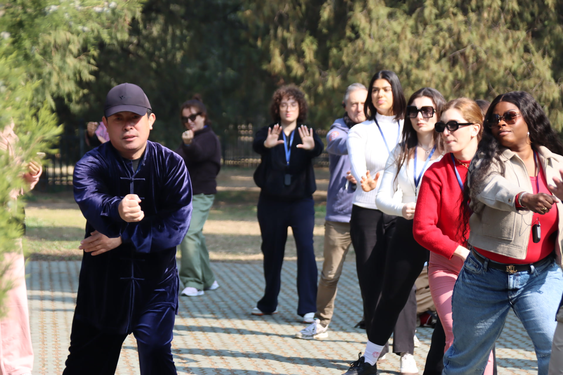 来自西班牙的塞尔吉奥练得尤其认真,他仔细学习陈燕明的动作还主动提出问题,请陈燕明手把手帮他调整动作。学到“云手”动作时,陈燕明示范时双手如拨流云,左掌向右划弧时吸气,右掌向左回带时呼气……游客们跟着模仿,尽管起初动作生涩,但随着练习深入也逐渐找到节奏。