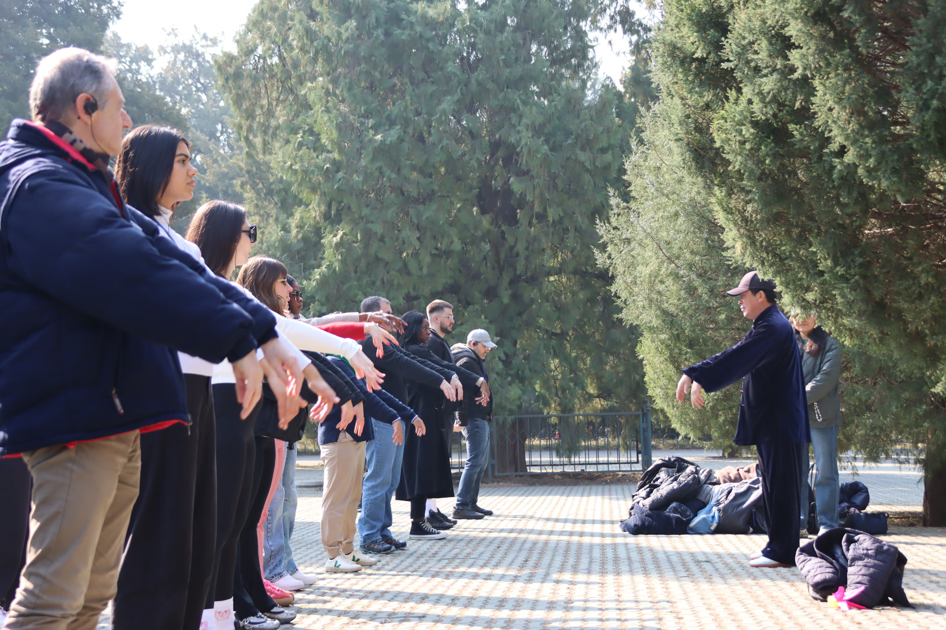 “沉肩、坠肘、手掌放下,再吸气时感受气息从脚底升起……”上午9时,天坛公园东门健身器材处,数十名外国游客正跟着太极推广者陈燕明学习太极拳,陈燕明身着深色太极练功服,周边是暗绿色的古柏,这几十名游客模仿着陈燕明的动作,抬臂、呼吸,微扎马步。