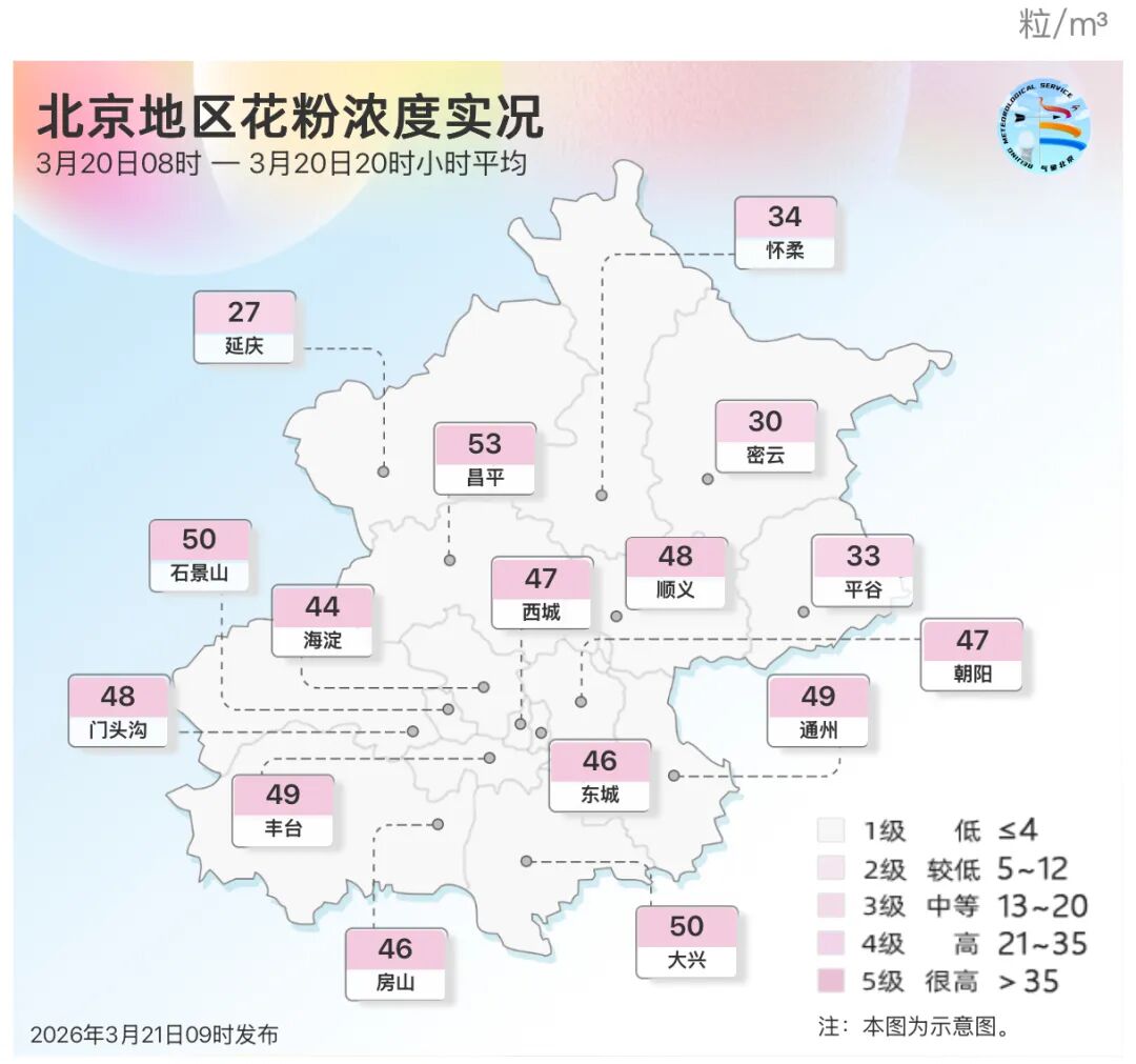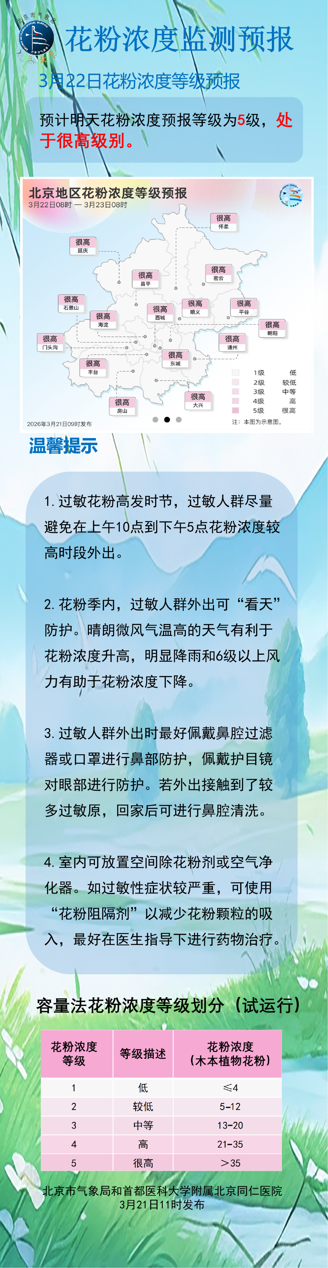 预计3月21日花粉浓度以4-5级为主,为高到很高级别(25-55粒/立方米)。