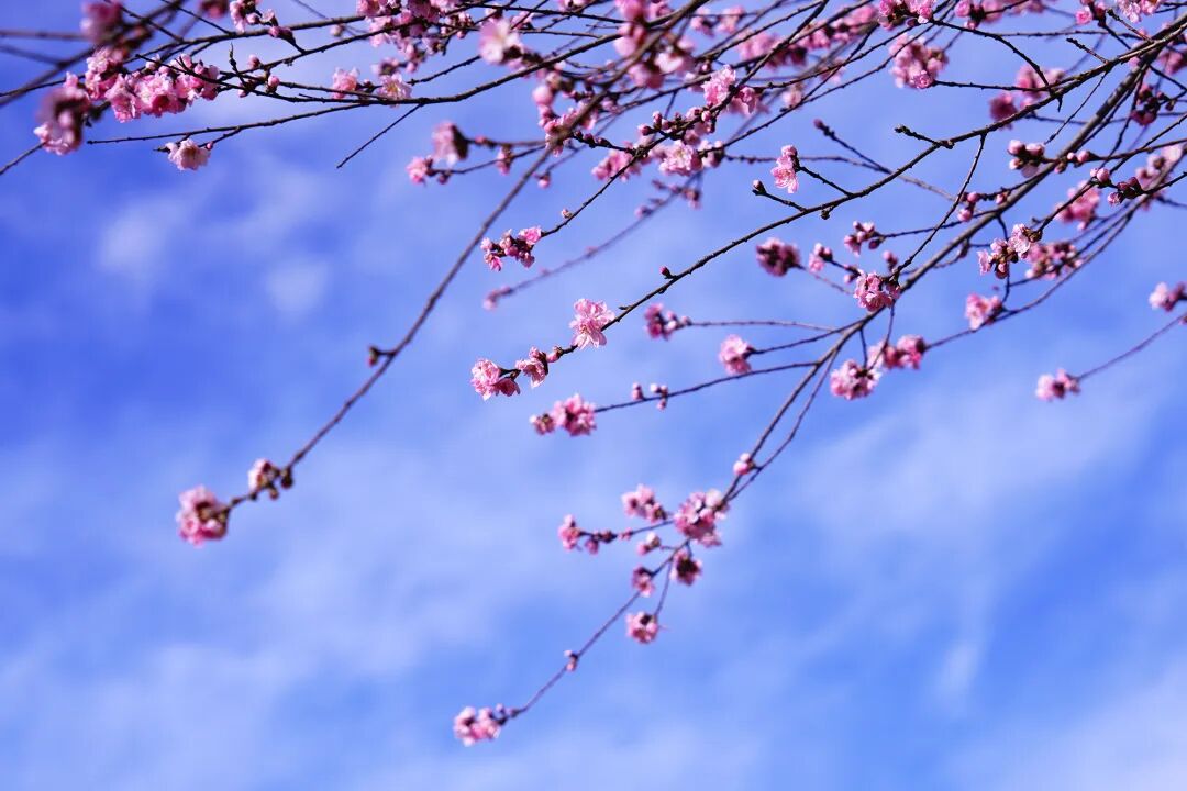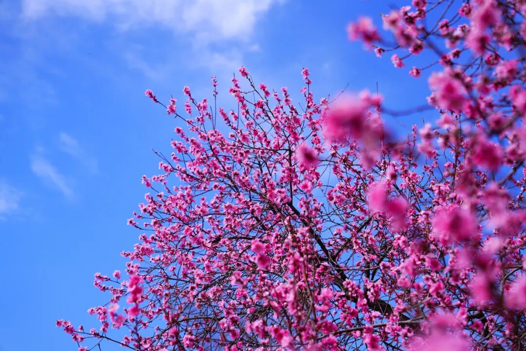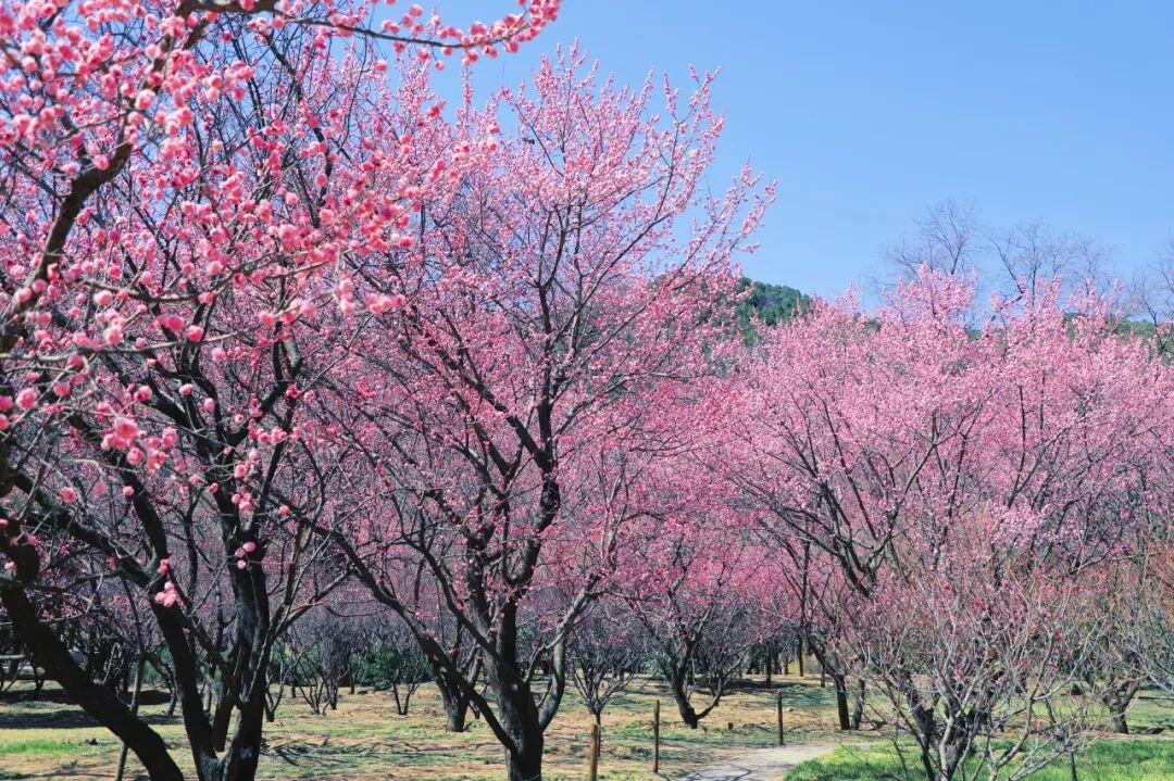 山路蜿蜒,栈道幽幽,步入梅花的世界,树干错落有致,花瓣层层铺展,在湛蓝的天幕下织就一片流动的云霞,成为春日里动人的亮色。