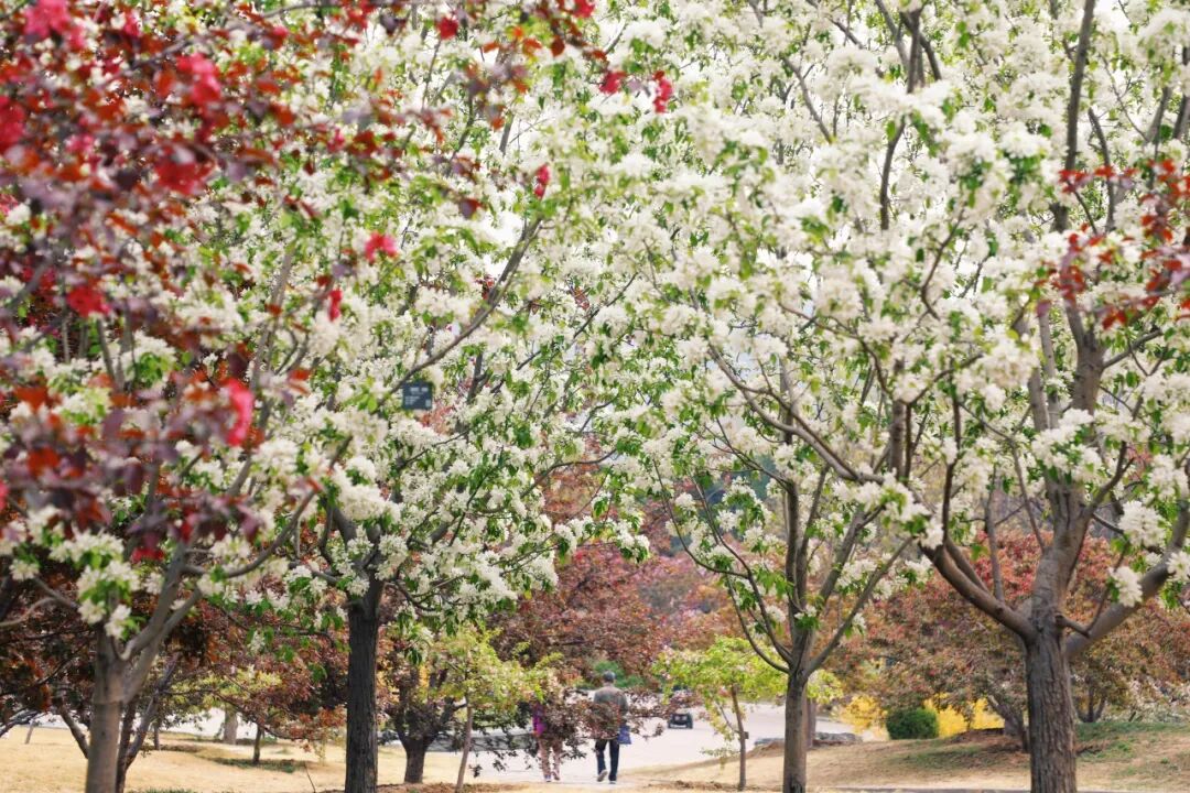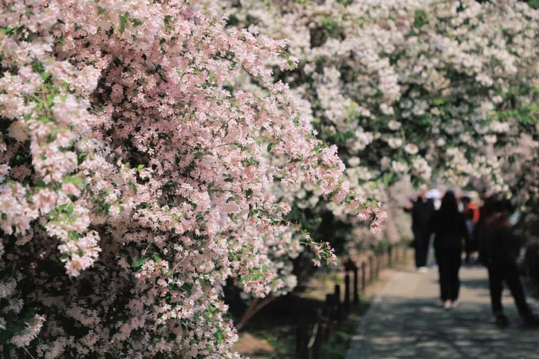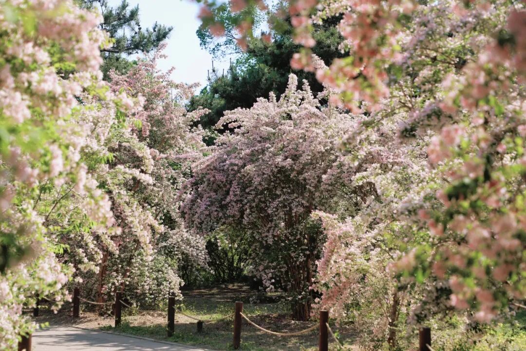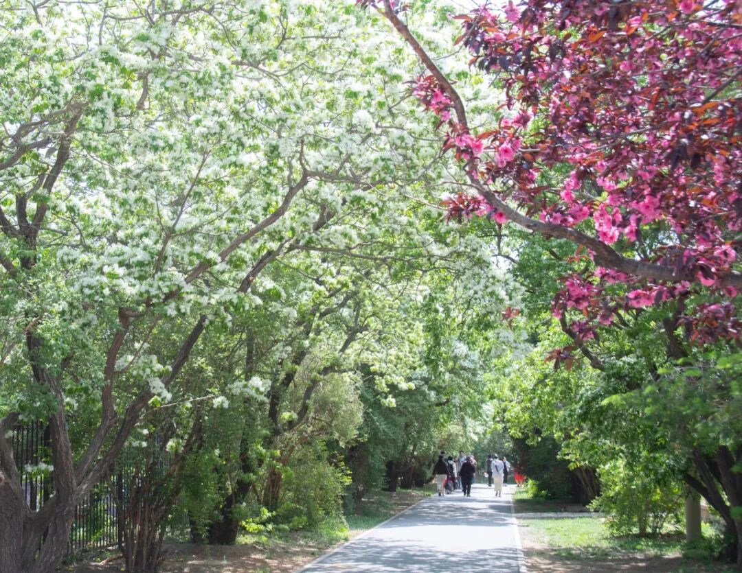 高大的“白花山碧桃”宛如天空中的云朵,轻盈而柔美,粉花山碧桃的粉色点缀其间交相辉映,构成了一条令人沉醉的山碧桃大道,繁花满枝将春日的诗情画意挥洒得淋漓尽致。