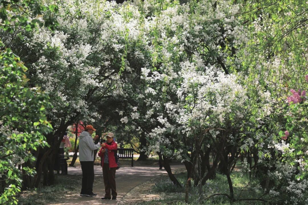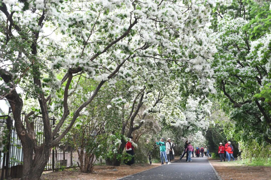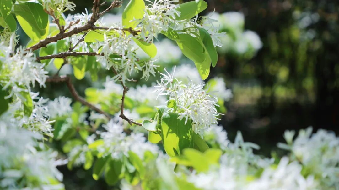流苏树树形挺拔,花色洁白,微风拂过,一树白花轻轻摇曳,优雅又不失灵动,仿佛在低语暮春的秘密。