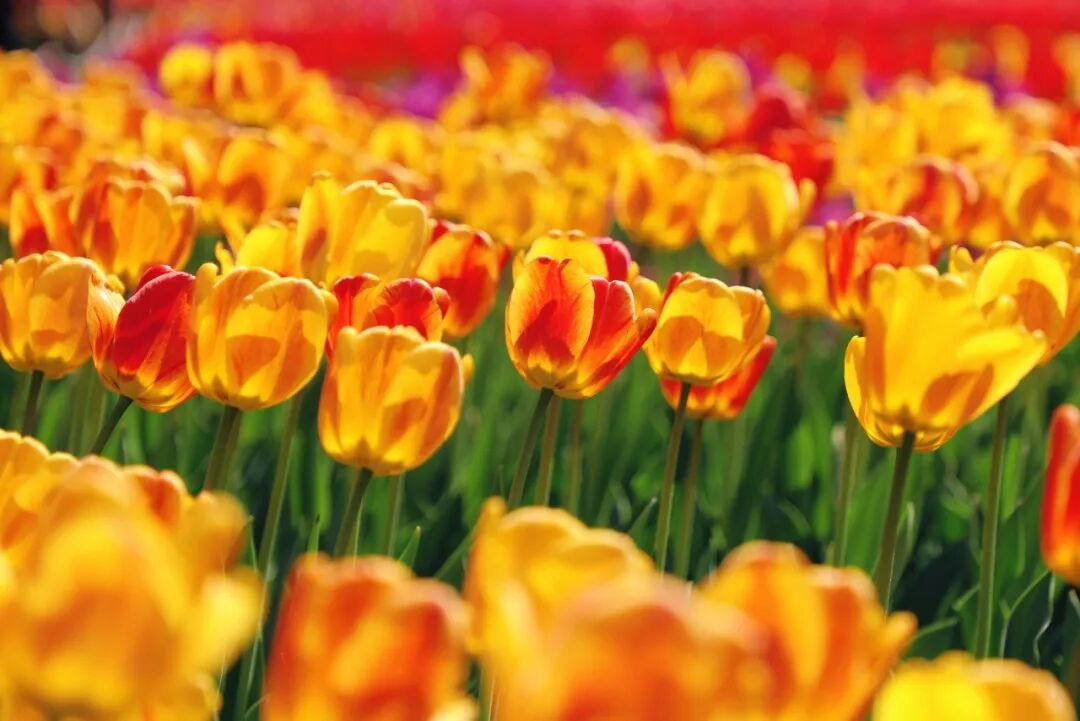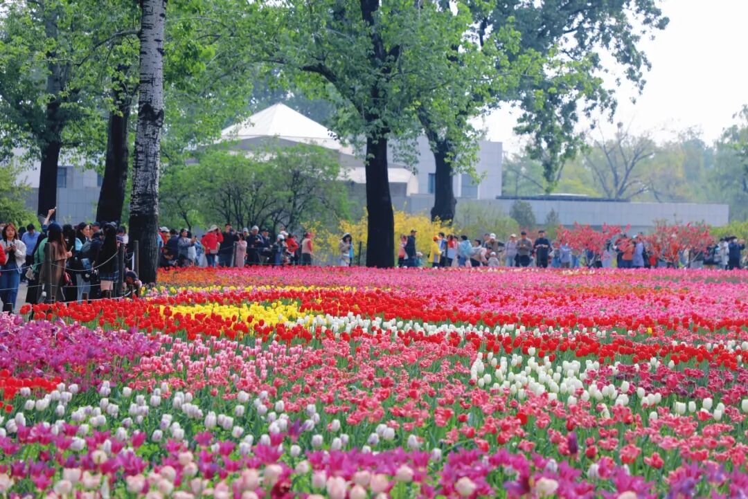 郁金香、风信子、洋水仙等100余个品种共20余万株的球根花卉在此争奇斗艳,色彩艳丽的郁金香,绘就出流畅优美的色带,在光影中交织跃动,宛如流转岁月铺展眼前,带来富有节奏的春日诗意。