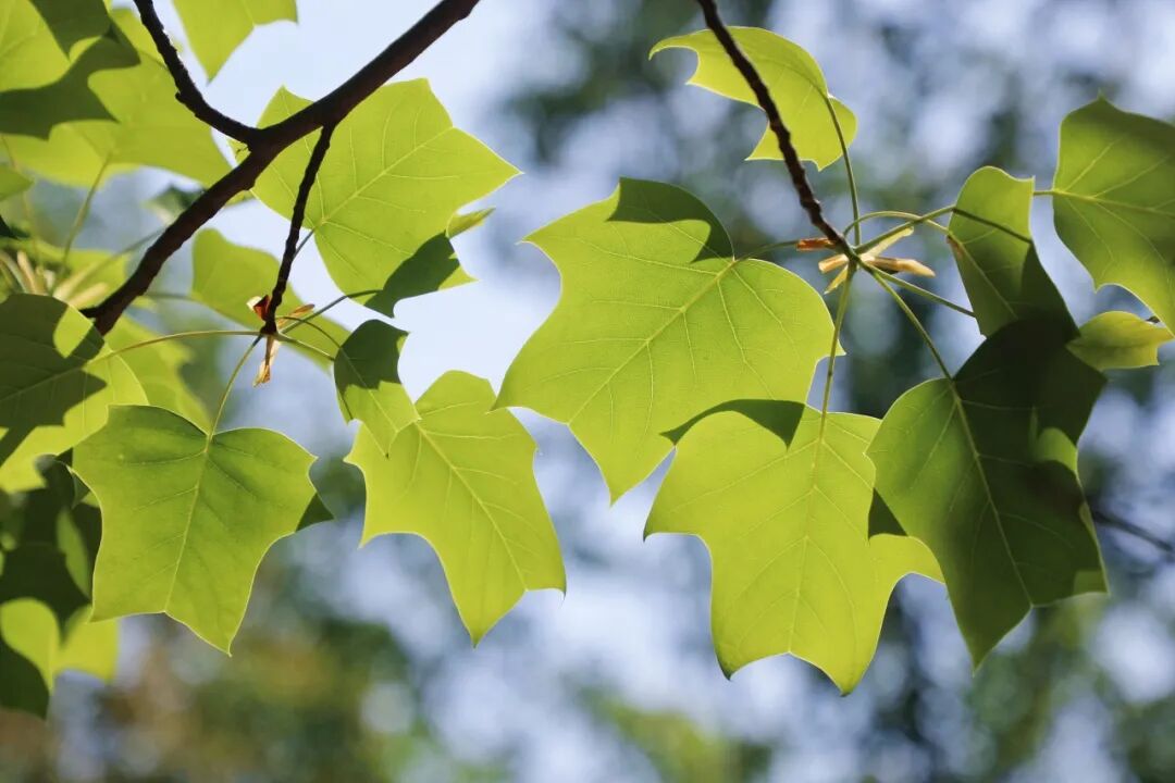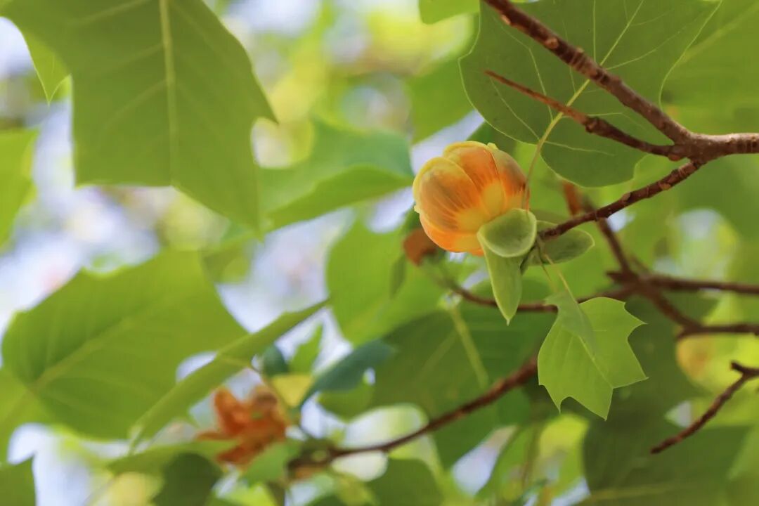 鹅掌楸的花与郁金香十分相似,正因如此它还有一个非常贴切的英文名 —— Tulip Tree(郁金香树)。一朵朵小花挂满了枝头,犹如树上开满了郁金香。近看它的树叶,又像一件件小马褂,为暮春之时增添一份乐趣。
