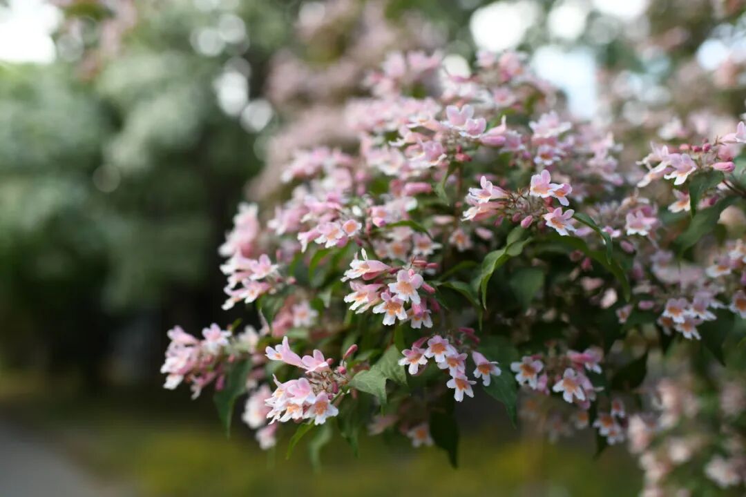 猬实是我国特有种,是一种十分美丽的观赏植物。满树粉红的花朵团团簇簇地挤在枝头,下垂的枝条让满树繁花倾泻而下,犹如粉色云雾层叠晕染,淡淡花香也随着微风悠悠飘荡。