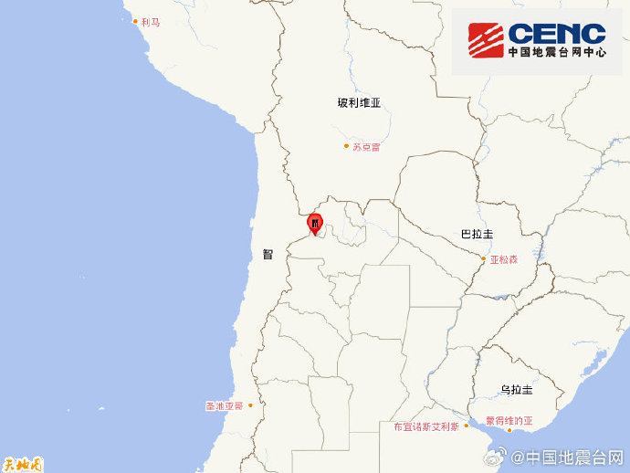 中国地震台网正式测定:03月21日18时00分在阿根廷(南纬24.10度,西经66.95度)发生5.4级地震,震源深度200千米。