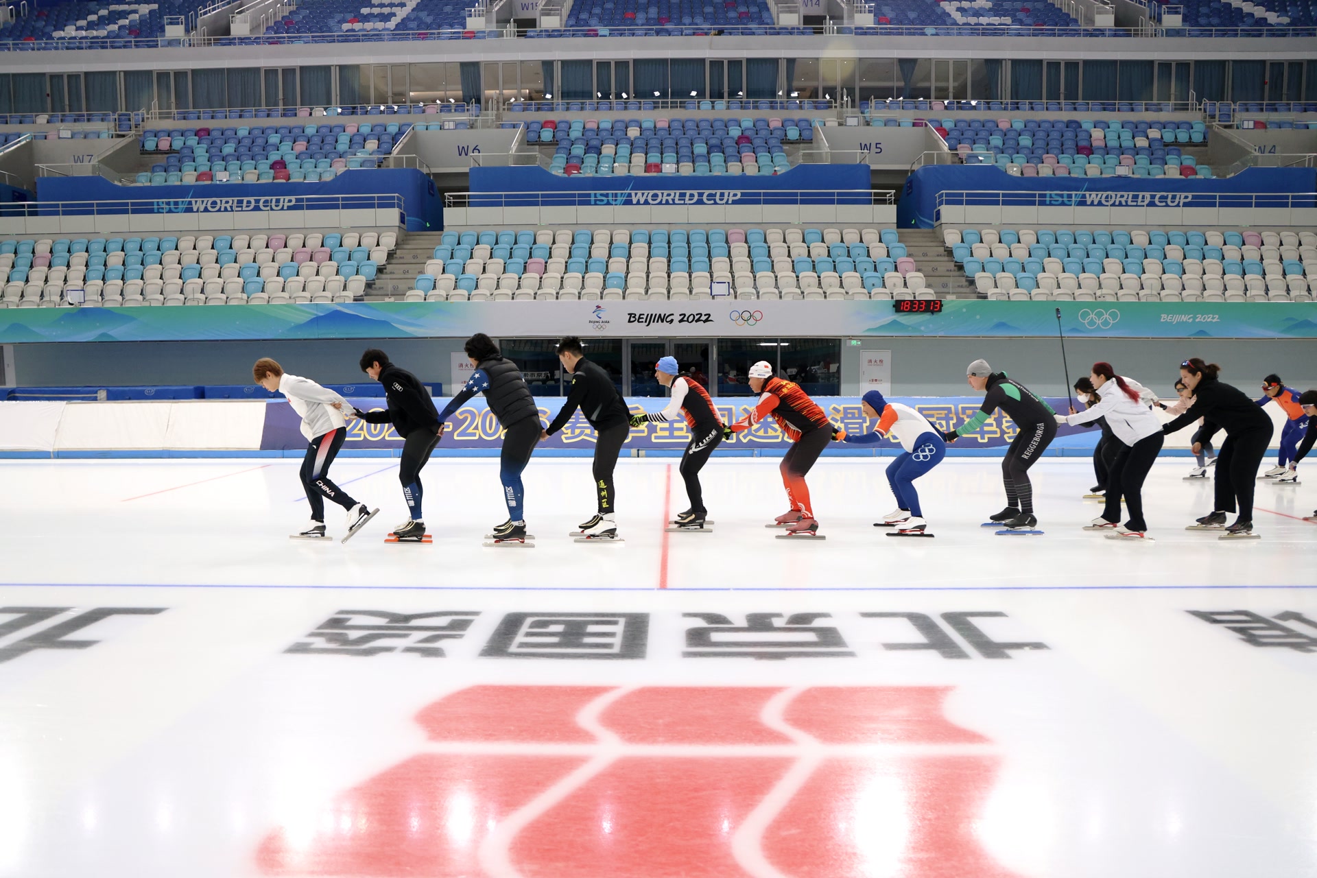 日前在米兰冬奥会中夺得男子团体追逐赛铜牌的国家队运动员刘瀚彬、吴宇、李文淏,以及中国速度滑冰队主教练李琰到场与大众选手互动。三位小伙子在李琰的指导下率领大家热身,并上冰作为“第一棒”,以团体赛的队形与民间高手共同畅滑冬奥赛道。