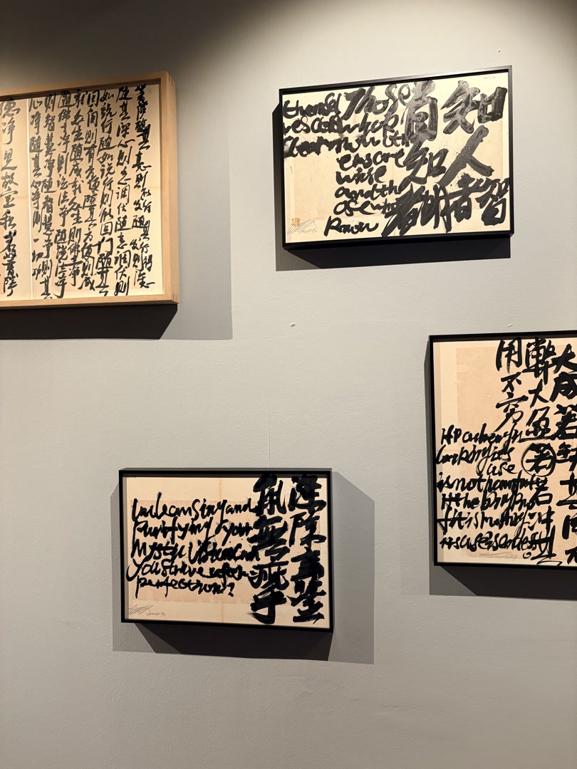 进入展厅,目之所及的第一件作品《孜孜千字》是一幅非传统意义上的书法作品。艺术家王绍强将传统笔法书写的《千字文》和《千字文》的英文翻译叠加在一起,而将中国文言文转译成英文的工作,是借由AI完成的,当AI生成的结果不准确或是有错误时,艺术家再继续修改完善。最终,所有的书写、修改、思考、涂抹痕迹叠加在一起,形成了这件作品。王绍强以此形式回应人工智能时代的到来,这件作品是他从三年前开始创作的,其间AI技术也在不断进化,AI会出错,会胡说八道,王绍强则是以观察者的身份,用艺术的形式记录了这一过程。