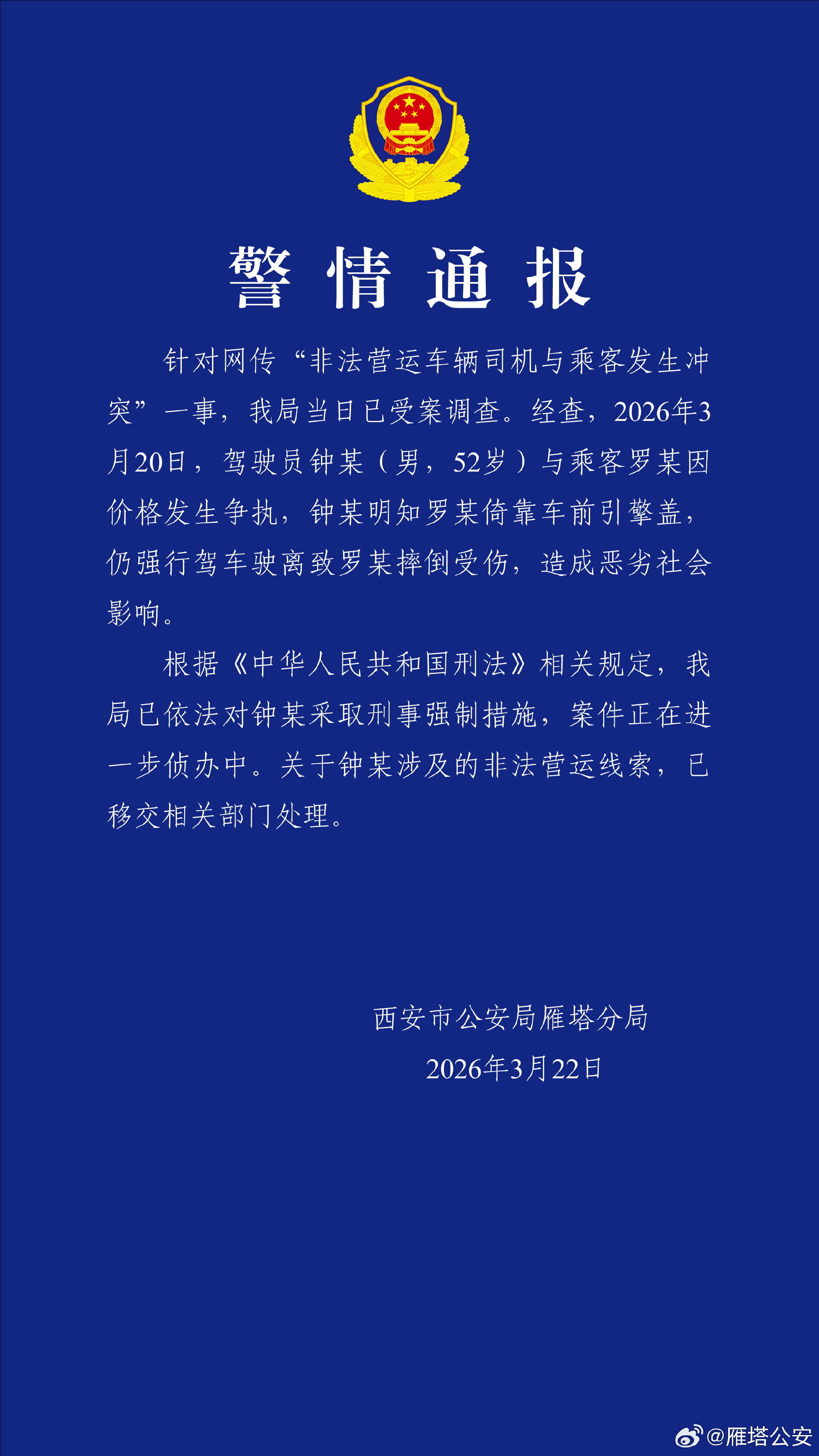3月22日,陕西省西安市@雁塔公安 发布警情通报:针对网传“非法营运车辆司机与乘客发生冲突”一事,警方当日已受案调查。
