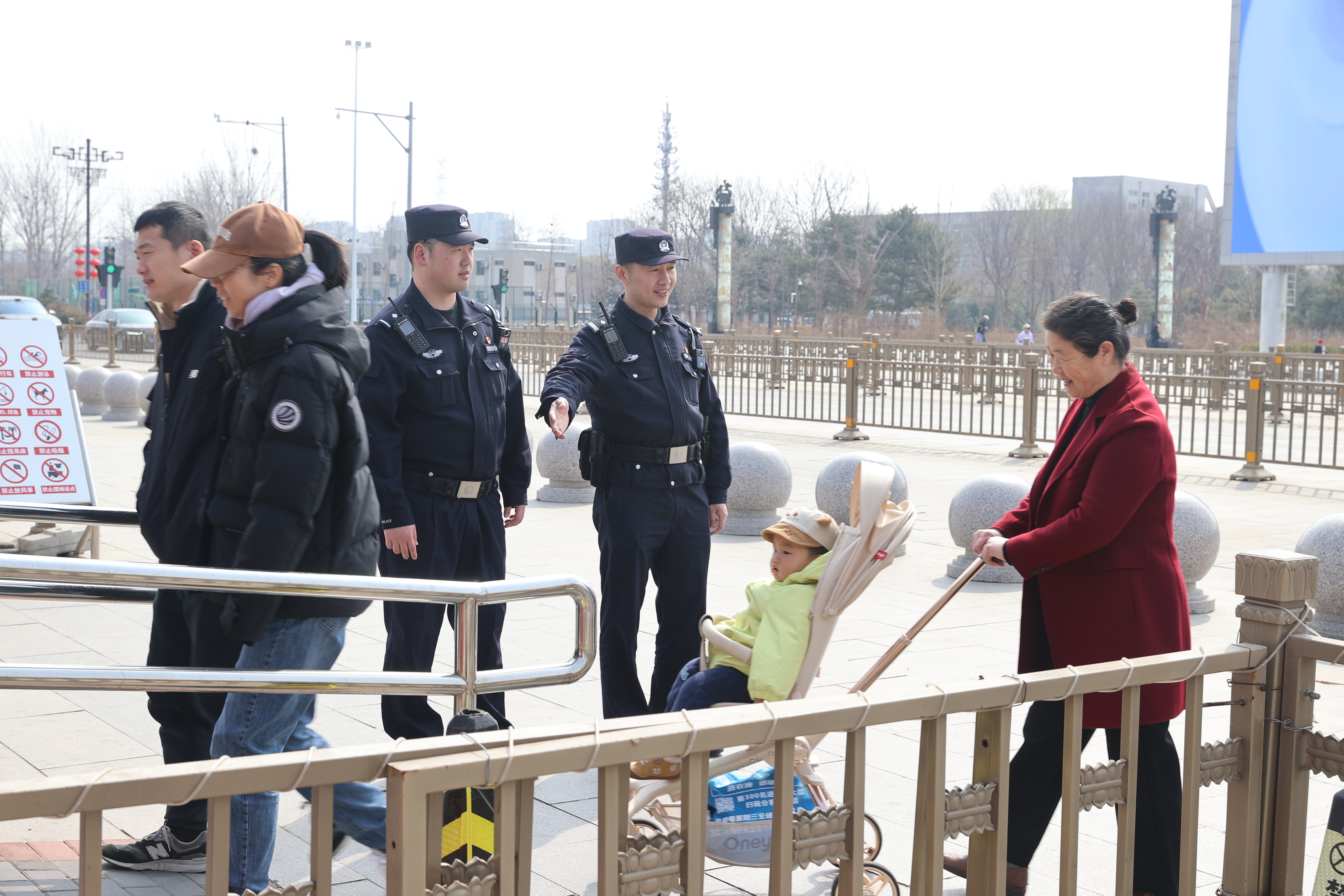 视线转入园内,秩序维护同样细致。在入园高峰时段,南海子公园派出所增派警力与公园管理方紧密配合,加强门区疏导。当实时人流量达到阈值时,在公园一期、二期南门等主要入口迅速启动分流措施,设置临时分流栏,确保游客安全、快速入园,将管理的“绣花功夫”用在游客体验的关键处。