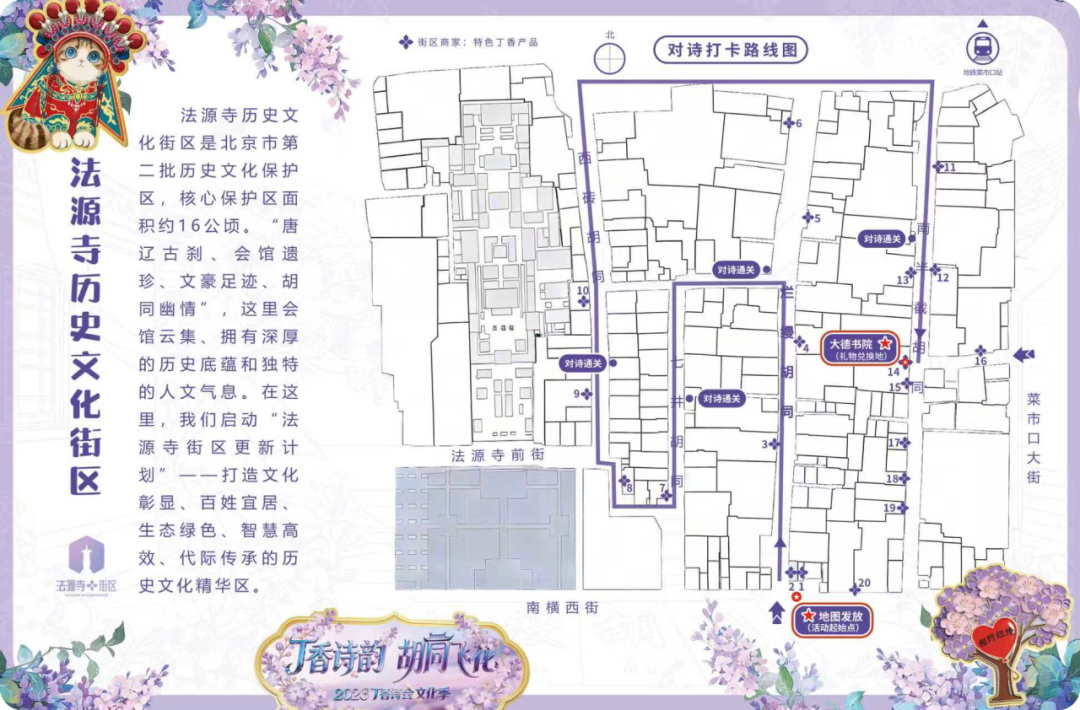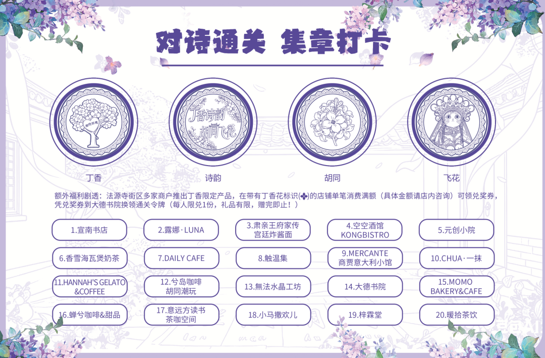 通关大奖:集齐全部4枚印章,可前往位于南半截胡同21号院的大德书院兑换丁香诗会精美纪念品。